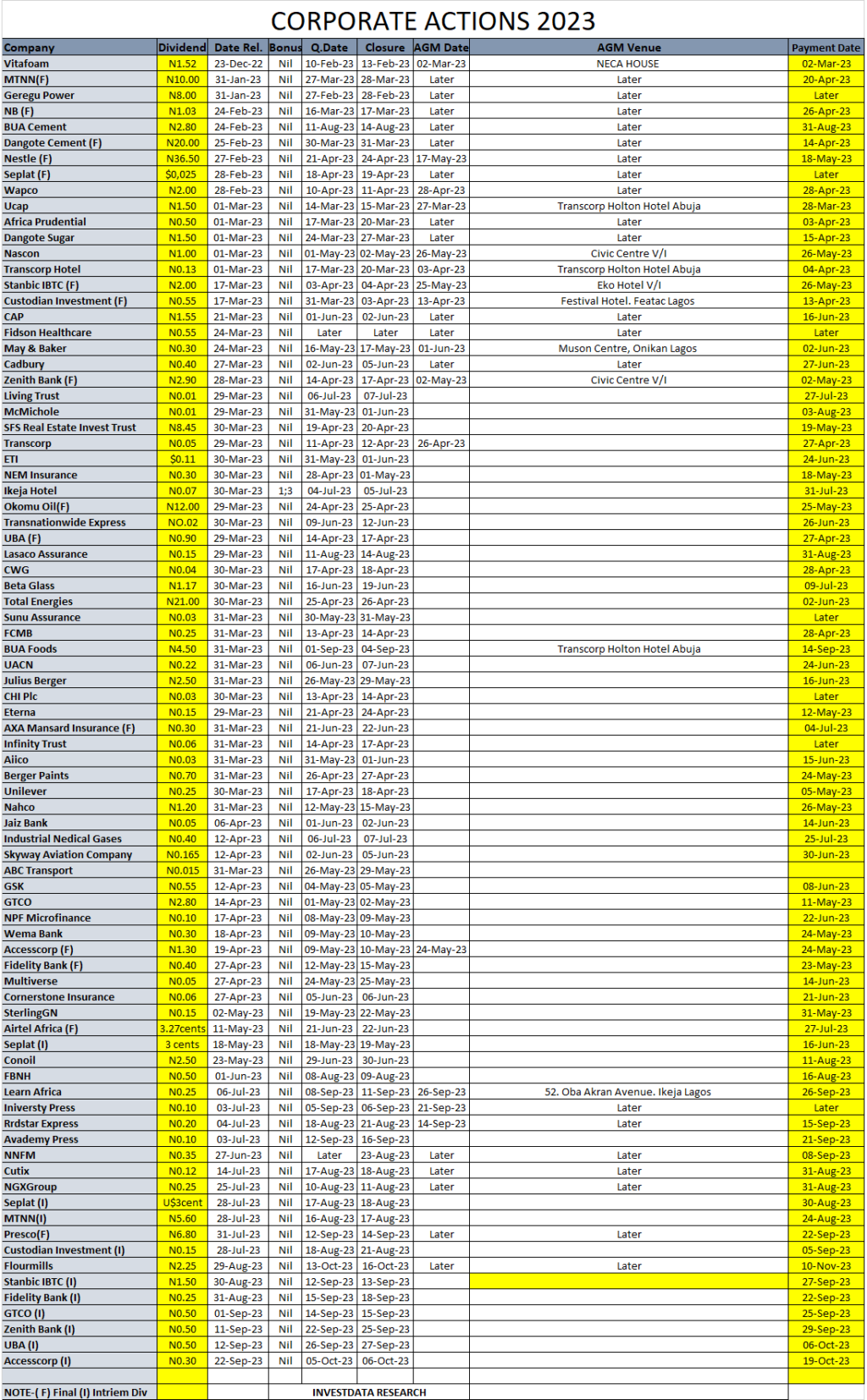 Equities Corporate actions On NGX as of Friday, September 29, 2023 Editor October 1, 2023 1 min read 330 Post Views: 120 Continue Reading Previous: Investdata Price, Earnings Tracking For Week Ended September 29, 2023Next: Sell Sentiment, Mixed Funds Flow, As Negative Data, News, Confirm Fragile Economy, Pause NGX Bull-run Trending Now NGX Consolidates As Bargain Hunting Counters Profit-Taking Amid Weak Volume 1 NGX Consolidates As Bargain Hunting Counters Profit-Taking Amid Weak Volume January 27, 2026 Oil Prices Steady But Supply Risks Persist 2 Oil Prices Steady But Supply Risks Persist January 27, 2026 Gold smashes $5,000, will it get to $6,000 this year? 3 Gold smashes $5,000, will it get to $6,000 this year? January 27, 2026 Bank Liquidation: NDIC, EFCC Agree Stronger Partnership For Asset Recovery, Prosecution Of Offenders 4 Bank Liquidation: NDIC, EFCC Agree Stronger Partnership For Asset Recovery, Prosecution Of Offenders January 26, 2026 Oil Prices Climb On Sanctions, Supply Risks 5 Oil Prices Climb On Sanctions, Supply Risks January 26, 2026 GDP: Nigeria Operating Far Below Its Productive Capacity 6 GDP: Nigeria Operating Far Below Its Productive Capacity January 25, 2026 Related Stories NGX Consolidates As Bargain Hunting Counters Profit-Taking Amid Weak Volume 3 min read Equities NGX Consolidates As Bargain Hunting Counters Profit-Taking Amid Weak Volume January 27, 2026 63 Corporate Actions On NGX As Of Friday, January 23, 2026 1 min read Equities Corporate Actions On NGX As Of Friday, January 23, 2026 January 24, 2026 120 NGX Ends Week On Cautious Positive Note As Selective Buying Offsets Profit-Taking Pressures 3 min read Equities NGX Ends Week On Cautious Positive Note As Selective Buying Offsets Profit-Taking Pressures January 24, 2026 124 NGX Ends Bearish On Heavyweight Selloffs Amid Cautious Sentiment 2 min read Equities NGX Ends Bearish On Heavyweight Selloffs Amid Cautious Sentiment January 23, 2026 198 Cautious Bargain Hunting Lifts Equities Marginally Amid Mixed Sector Performance 3 min read Equities Cautious Bargain Hunting Lifts Equities Marginally Amid Mixed Sector Performance January 22, 2026 175 Nigerian Equities Post Modest Rebound As Bargain Hunting, Oil Strength Support Market 3 min read Equities Nigerian Equities Post Modest Rebound As Bargain Hunting, Oil Strength Support Market January 21, 2026 194
