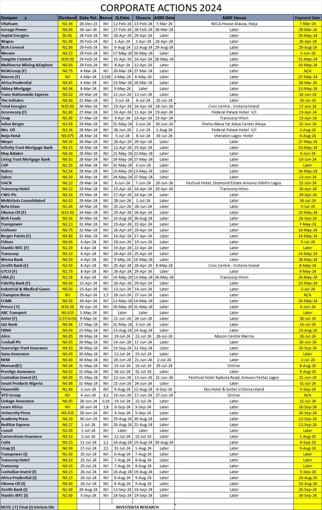 Equities Corporate Actions On NGX As Of Friday, September 6, 2024 Editor September 7, 2024 1 min read 276 Post Views: 112 Continue Reading Previous: Investdata Price, Earnings Tracking For Week Ended September 6, 2024Next: Mixed Sentiment, Bargain Hunting,As Investors Bet On Interim Div Banks, Macro-Economic Data Trending Now Nigerian Index Extends Two-Week Strong Buying Interests On Low Cap Stocks, Blue-Chip Gains 1 Nigerian Index Extends Two-Week Strong Buying Interests On Low Cap Stocks, Blue-Chip Gains December 13, 2025 Corporate Actions On NGX As Of Friday, December 11, 2025 2 Corporate Actions On NGX As Of Friday, December 11, 2025 December 13, 2025 FCMB Group Plc: Still Undervalued Despite Growing Profit , Greater Efficiency, Resilience 3 FCMB Group Plc: Still Undervalued Despite Growing Profit , Greater Efficiency, Resilience December 12, 2025 Oil Prices Slip As Market Watches Russia-Ukraine Peace Talks 4 Oil Prices Slip As Market Watches Russia-Ukraine Peace Talks December 12, 2025 Nigerian Bourse Rebounds Strongly, Index Gains 0.74% Amid Broad-Based Buying, Market Outlook Turns Firmer 5 Nigerian Bourse Rebounds Strongly, Index Gains 0.74% Amid Broad-Based Buying, Market Outlook Turns Firmer December 11, 2025 Oil Prices Steady Ahead Of U.S. Rate Decision, Ukraine Peace Talks 6 Oil Prices Steady Ahead Of U.S. Rate Decision, Ukraine Peace Talks December 11, 2025 Related Stories Corporate Actions On NGX As Of Friday, December 11, 2025 1 min read Equities Corporate Actions On NGX As Of Friday, December 11, 2025 December 13, 2025 38 Nigerian Bourse Rebounds Strongly, Index Gains 0.74% Amid Broad-Based Buying, Market Outlook Turns Firmer 3 min read Equities Nigerian Bourse Rebounds Strongly, Index Gains 0.74% Amid Broad-Based Buying, Market Outlook Turns Firmer December 11, 2025 63 NGX Index Slips Again As Broad Profit-Taking Persists, Investors Brace For Year-End Rebalancing 3 min read Equities NGX Index Slips Again As Broad Profit-Taking Persists, Investors Brace For Year-End Rebalancing December 10, 2025 34 Nigeria’s NGX Slips As Profit Taking Halts Rally Amid Cautious Investor Sentiments 3 min read Equities Nigeria’s NGX Slips As Profit Taking Halts Rally Amid Cautious Investor Sentiments December 9, 2025 25 Nigeria’s NGX Opens Week Strong As Bulls Tighten Grip, Banking Stocks Lead Momentum 4 min read Equities Nigeria’s NGX Opens Week Strong As Bulls Tighten Grip, Banking Stocks Lead Momentum December 9, 2025 10 Corporate Actions On Nigeran Exchange As Of Friday, December 5, 2025 1 min read Equities Corporate Actions On Nigeran Exchange As Of Friday, December 5, 2025 December 6, 2025 4