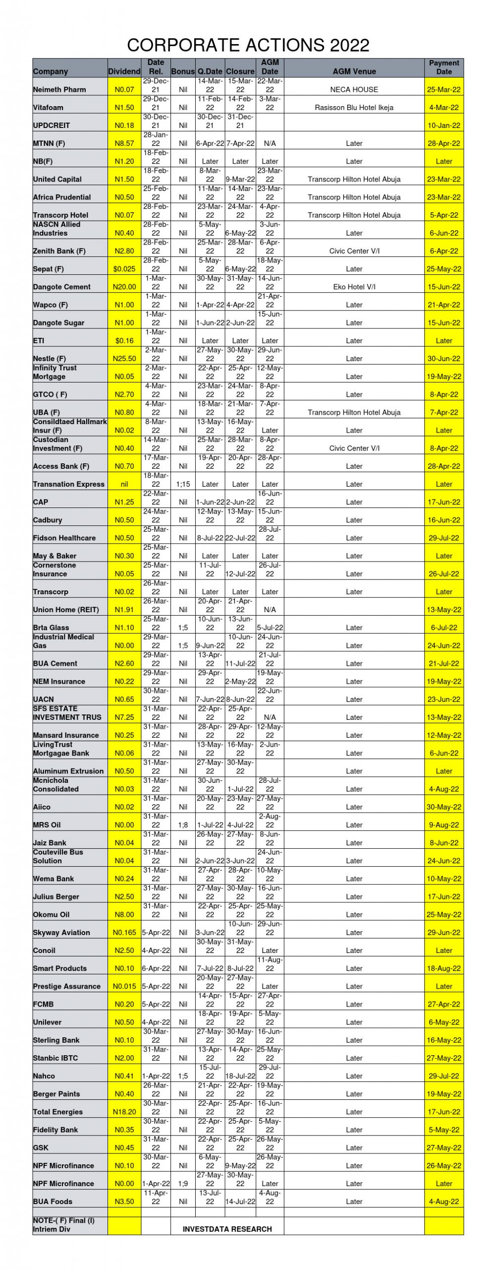 Equities Corporate Actions On NGX Exchange As Of Thursday, April 14, 2022 April 17, 2022 1 min read 381 Post Views: 364 14 Continue Reading Previous: Investdata Price, Earnings Tracking For Week Ended April 14, 2022Next: Expect Trend Reversal After Profit-taking On More 2022Q1 Earnings Inflow Trending Now GDP: Nigeria Operating Far Below Its Productive Capacity 1 GDP: Nigeria Operating Far Below Its Productive Capacity January 25, 2026 Nigerian Bourse Ranges On Profit Taking Ahead Earnings Expectations, Sector Rotation 2 Nigerian Bourse Ranges On Profit Taking Ahead Earnings Expectations, Sector Rotation January 24, 2026 Corporate Actions On NGX As Of Friday, January 23, 2026 3 Corporate Actions On NGX As Of Friday, January 23, 2026 January 24, 2026 NGX Ends Week On Cautious Positive Note As Selective Buying Offsets Profit-Taking Pressures 4 NGX Ends Week On Cautious Positive Note As Selective Buying Offsets Profit-Taking Pressures January 24, 2026 NGX Ends Bearish On Heavyweight Selloffs Amid Cautious Sentiment 5 NGX Ends Bearish On Heavyweight Selloffs Amid Cautious Sentiment January 23, 2026 Oil Slides as Geopolitical Tensions Ease, But Supply Concerns Linger 6 Oil Slides as Geopolitical Tensions Ease, But Supply Concerns Linger January 23, 2026 Related Stories Corporate Actions On NGX As Of Friday, January 23, 2026 1 min read Equities Corporate Actions On NGX As Of Friday, January 23, 2026 January 24, 2026 69 NGX Ends Week On Cautious Positive Note As Selective Buying Offsets Profit-Taking Pressures 3 min read Equities NGX Ends Week On Cautious Positive Note As Selective Buying Offsets Profit-Taking Pressures January 24, 2026 80 NGX Ends Bearish On Heavyweight Selloffs Amid Cautious Sentiment 2 min read Equities NGX Ends Bearish On Heavyweight Selloffs Amid Cautious Sentiment January 23, 2026 165 Cautious Bargain Hunting Lifts Equities Marginally Amid Mixed Sector Performance 3 min read Equities Cautious Bargain Hunting Lifts Equities Marginally Amid Mixed Sector Performance January 22, 2026 170 Nigerian Equities Post Modest Rebound As Bargain Hunting, Oil Strength Support Market 3 min read Equities Nigerian Equities Post Modest Rebound As Bargain Hunting, Oil Strength Support Market January 21, 2026 191 Nigerian Equities End Flat-To-Bearish As Profit Taking Offsets Broad Buying, Composite Index Holds Key Support 3 min read Equities Nigerian Equities End Flat-To-Bearish As Profit Taking Offsets Broad Buying, Composite Index Holds Key Support January 20, 2026 195