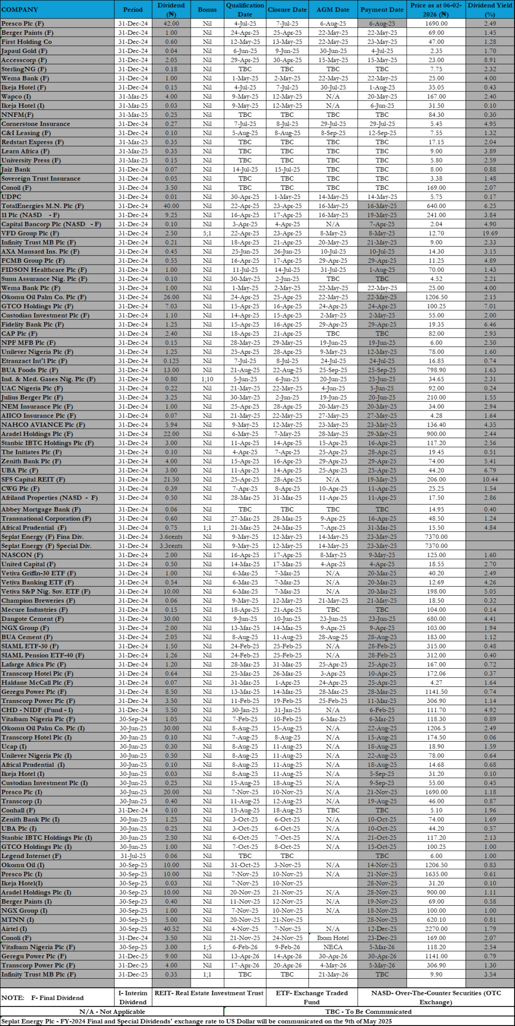 Equities Corporate Actions On Nigerian Bourse As Of Friday, February 13, 2026 Editor February 16, 2026 1 min read 36 Post Views: 9 Continue Reading Previous: NGX Closes Week Strong As Blue Chips Drive Composite Index Higher Trending Now Corporate Actions On Nigerian Bourse As Of Friday, February 13, 2026 1 Corporate Actions On Nigerian Bourse As Of Friday, February 13, 2026 February 16, 2026 NGX Surges To New All-Time High As Strong Buying Propels Composite Index Above182,00Psychological Line 2 NGX Surges To New All-Time High As Strong Buying Propels Composite Index Above182,00Psychological Line February 16, 2026 NGX Closes Week Strong As Blue Chips Drive Composite Index Higher 3 NGX Closes Week Strong As Blue Chips Drive Composite Index Higher February 13, 2026 Oil Prices Fall On Weaker Demand, Rising Supply 4 Oil Prices Fall On Weaker Demand, Rising Supply February 13, 2026 Nigeria’s Equity Market Maintains Bullish Bias As Selective Buying Drives Gains 5 Nigeria’s Equity Market Maintains Bullish Bias As Selective Buying Drives Gains February 13, 2026 Oil Gains As U.S.–Iran Tensions Offset Inventory Surge 6 Oil Gains As U.S.–Iran Tensions Offset Inventory Surge February 12, 2026 Related Stories NGX Closes Week Strong As Blue Chips Drive Composite Index Higher 3 min read Equities NGX Closes Week Strong As Blue Chips Drive Composite Index Higher February 13, 2026 206 Nigeria’s Equity Market Maintains Bullish Bias As Selective Buying Drives Gains 3 min read Equities Nigeria’s Equity Market Maintains Bullish Bias As Selective Buying Drives Gains February 13, 2026 146 Oil Gains As U.S.–Iran Tensions Offset Inventory Surge 2 min read Equities Oil Gains As U.S.–Iran Tensions Offset Inventory Surge February 12, 2026 148 Bullish Momentum Persists As NGX Extends Winning Streak 3 min read Equities Bullish Momentum Persists As NGX Extends Winning Streak February 12, 2026 176 Delayed: Nigerian Bourse Rally Persists as Benchmark Index Gains 1.65% 4 min read Equities Delayed: Nigerian Bourse Rally Persists as Benchmark Index Gains 1.65% February 11, 2026 183 Corporate Actions On Nigerian Bourse As Of February 6, 2026 1 min read Equities Corporate Actions On Nigerian Bourse As Of February 6, 2026 February 9, 2026 168