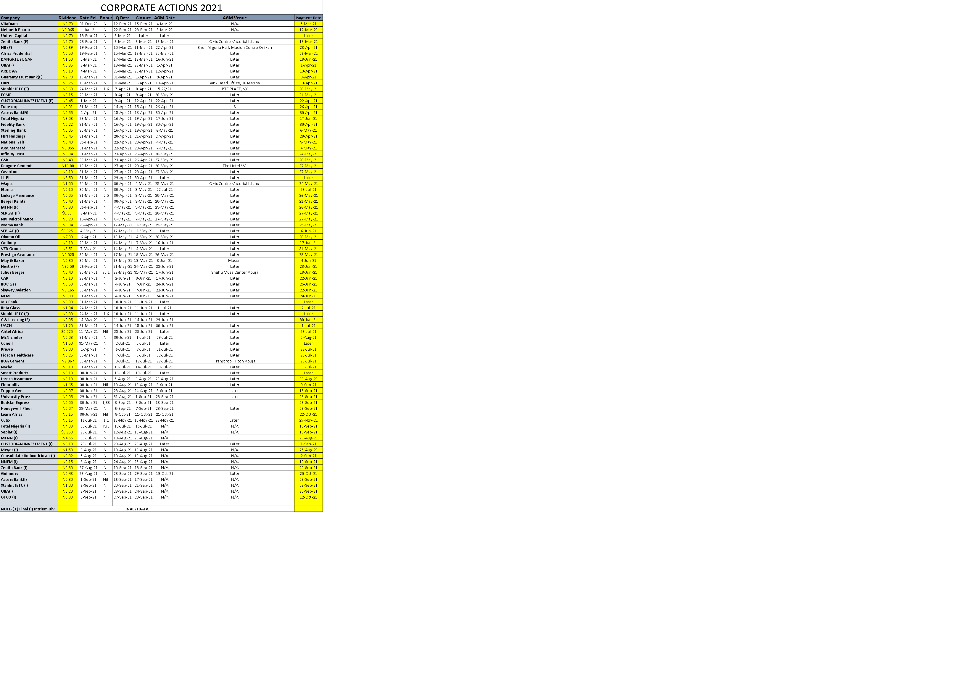 Equities Corporate Actions On The NGX As Of Thursday, September 30, 2021 October 2, 2021 1 min read 150 Post Views: 284 Continue Reading Previous: Investdata Price, Earnings Tracking For Week Ended September 30, 2021Next: October Outlook: Portfolio Adjustments Ahead 2022, As Investors Target Strong Q3 Earnings Growth Trending Now NGX Closes Week Strong As Blue Chips Drive Composite Index Higher 1 NGX Closes Week Strong As Blue Chips Drive Composite Index Higher February 13, 2026 Oil Prices Fall On Weaker Demand, Rising Supply 2 Oil Prices Fall On Weaker Demand, Rising Supply February 13, 2026 Nigeria’s Equity Market Maintains Bullish Bias As Selective Buying Drives Gains 3 Nigeria’s Equity Market Maintains Bullish Bias As Selective Buying Drives Gains February 13, 2026 Oil Gains As U.S.–Iran Tensions Offset Inventory Surge 4 Oil Gains As U.S.–Iran Tensions Offset Inventory Surge February 12, 2026 Bullish Momentum Persists As NGX Extends Winning Streak 5 Bullish Momentum Persists As NGX Extends Winning Streak February 12, 2026 Delayed: Nigerian Bourse Rally Persists as Benchmark Index Gains 1.65% 6 Delayed: Nigerian Bourse Rally Persists as Benchmark Index Gains 1.65% February 11, 2026 Related Stories NGX Closes Week Strong As Blue Chips Drive Composite Index Higher 3 min read Equities NGX Closes Week Strong As Blue Chips Drive Composite Index Higher February 13, 2026 80 Nigeria’s Equity Market Maintains Bullish Bias As Selective Buying Drives Gains 3 min read Equities Nigeria’s Equity Market Maintains Bullish Bias As Selective Buying Drives Gains February 13, 2026 83 Oil Gains As U.S.–Iran Tensions Offset Inventory Surge 2 min read Equities Oil Gains As U.S.–Iran Tensions Offset Inventory Surge February 12, 2026 83 Bullish Momentum Persists As NGX Extends Winning Streak 3 min read Equities Bullish Momentum Persists As NGX Extends Winning Streak February 12, 2026 102 Delayed: Nigerian Bourse Rally Persists as Benchmark Index Gains 1.65% 4 min read Equities Delayed: Nigerian Bourse Rally Persists as Benchmark Index Gains 1.65% February 11, 2026 135 Corporate Actions On Nigerian Bourse As Of February 6, 2026 1 min read Equities Corporate Actions On Nigerian Bourse As Of February 6, 2026 February 9, 2026 155