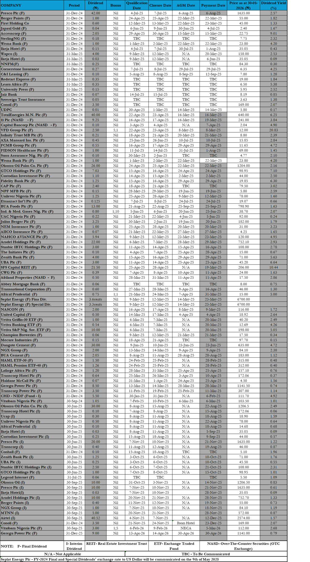 Equities Corporate Actions On The Nigerian Bourse As Of Friday, January 30, 2026 Editor January 31, 2026 1 min read 22 Post Views: 5 Continue Reading Previous: NGX Edges Up on Renewed Investor Appetite, Strong Crude PricesNext: Banking Profit-Taking Keeps NGX Under Pressure As Market Enters Consolidation Phase Trending Now Banking Profit-Taking Keeps NGX Under Pressure As Market Enters Consolidation Phase 1 Banking Profit-Taking Keeps NGX Under Pressure As Market Enters Consolidation Phase January 31, 2026 Corporate Actions On The Nigerian Bourse As Of Friday, January 30, 2026 2 Corporate Actions On The Nigerian Bourse As Of Friday, January 30, 2026 January 31, 2026 US Government Shutdown Fueling Anti-Dollar Trade, Expert Warns 3 US Government Shutdown Fueling Anti-Dollar Trade, Expert Warns January 30, 2026 Brent Crude Hits Six-Month High On Iran Tensions 4 Brent Crude Hits Six-Month High On Iran Tensions January 30, 2026 Recapitalisation Deadline: Nigeria’s Central Bank Hosts UK DFI, Restates Commitment To Financial Sector Reform, Long-Term Capital 5 Recapitalisation Deadline: Nigeria’s Central Bank Hosts UK DFI, Restates Commitment To Financial Sector Reform, Long-Term Capital January 30, 2026 NGX Edges Up on Renewed Investor Appetite, Strong Crude Prices 6 NGX Edges Up on Renewed Investor Appetite, Strong Crude Prices January 29, 2026 Related Stories Banking Profit-Taking Keeps NGX Under Pressure As Market Enters Consolidation Phase 3 min read Equities Banking Profit-Taking Keeps NGX Under Pressure As Market Enters Consolidation Phase January 31, 2026 30 NGX Edges Up on Renewed Investor Appetite, Strong Crude Prices 3 min read Equities NGX Edges Up on Renewed Investor Appetite, Strong Crude Prices January 29, 2026 135 Nigerian Stocks Retreat Midweek, Profit-Taking Deepens, As Market Eyes Near-Term Support 3 min read Equities Nigerian Stocks Retreat Midweek, Profit-Taking Deepens, As Market Eyes Near-Term Support January 29, 2026 162 NGX Closes Slightly Higher As Selective Buying Supports Market 3 min read Equities NGX Closes Slightly Higher As Selective Buying Supports Market January 28, 2026 174 NGX Consolidates As Bargain Hunting Counters Profit-Taking Amid Weak Volume 3 min read Equities NGX Consolidates As Bargain Hunting Counters Profit-Taking Amid Weak Volume January 27, 2026 169 Corporate Actions On NGX As Of Friday, January 23, 2026 1 min read Equities Corporate Actions On NGX As Of Friday, January 23, 2026 January 24, 2026 191