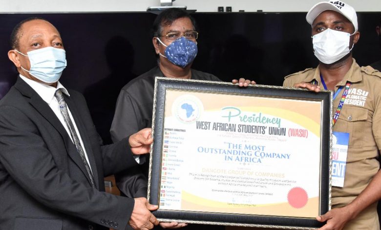 Photo caption: From left, Group Chief Branding & Communications Officer, Dangote Industries Limited, Anthony Chiejina; and the Group Executive Director, Strategy, Capital Projects & Portfolio Development, Devakumar Edwin; receiving “The Most Outstanding Company in Africa” award from Diplomatic President, West African Student’s Union (WASU), Comrade Romans Pillah, during a visit to Dangote Industries’ Lagos head office recently.