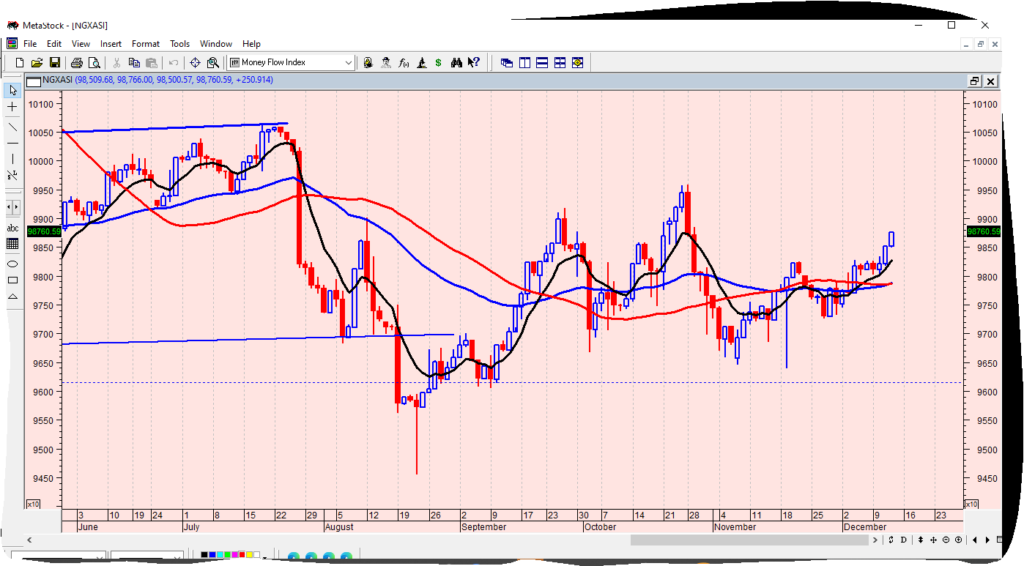 Money flow and other momentum tools were up, presenting buy opportunities for market players who understand the importance of buying low and selling high in any market condition in the midst ongoing volatility and buying sentiment. As index is heading strong resistance levels of 98,932.46 basis points and 98,987.42ps to sustain uptrend, thereby creating the perfect setup for high probability of continuation to catch end of year repositioning at the right price. Also, as the index trades above the T-line and the two moving averages of 50-EMA and 50-SMA, this indicates relatively strength in the midst of changing market fundamentals and technicals on the NGX and the economy.