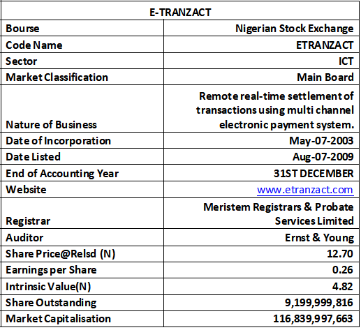 At inception, it had an initial capital of N1,000,000, and quickly evolved from a simple pay outlet for services like Econet Wireless Limited (now Airtel) and the Lagos State Water Corporation into a comprehensive, multi-channel payment solution provider. In 2009, E-Tranzact became a publicly listed company on the Nigerian Stock Exchange (now Nigerian Exchange Limited).
