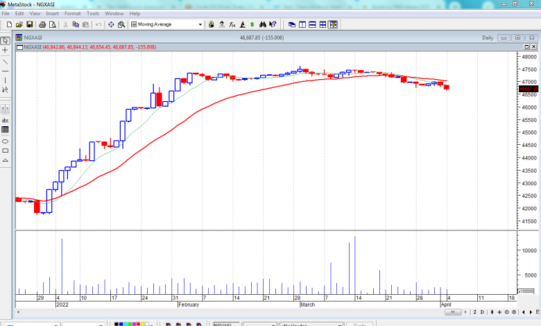 The candlestick formation at the end of trading reveals that sellers are having the upper hand, a trend that may likely lead to a continuation or reversal, depending on market forces as all eyes are on companies’ Q1 results. The NGX index’s action broke down another minor support level of 46,800, trading below its 20-day moving average. As volatility persists and the uptrend towards the next support level is sported around 46,540.19bps. Should the index break this point, the next visible level is 45,000 points.