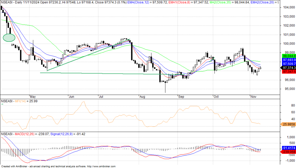 The NGX index has formed a top chart pattern at the end of Monday’s trading that signals reversal and profit taking in need of confirmation as trading opens on Tuesday. This retracement from strong resistance level of 97,548.03 basis points and 97,666.35bps, after forming a topping-tail and hammer candle in an uptrend. This created the perfect setup for high probability of pullback to catch end of year repositioning. Also, the index trading flat on the T-line and below the two moving averages of 50-EMA and 50-SMA, this indicate relatively strong momentum and somewhat in the midst of changing market fundamentals and technicals on the NGX and the larger economy, as business activities continued to contract as revealed by October PMI that reads 46.9 points according to Stanbic IBTC reports