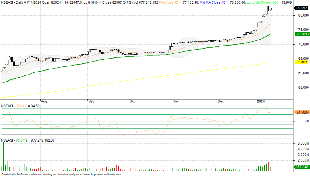 The strength behind the trend or the session recovery were revealed by momentum indicators, despite the overbought state of the market, as the ADX read 65.48, while RSI and Money Flow Index are looking down to 84.58 and 81.29 points against the previous session 83.72 and 83.37 points respectively. This should be a concern for discerning investors, as smart traders could cash out capital gain any time. The trading volume pattern suggests hold and watch disposition of market players and full return of many players who had gone on holidays and institutional investors accumulating more positions as others investment windows returns remain below inflation and negative. Also, the anticipated financial market and economic reset in 2024, comes with huge opportunities to create wealth for smart investors and traders.