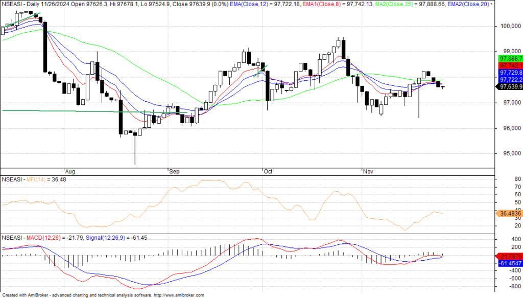 The buying sentiment in the midst of expected retracement from support level of 97,477.80 basis points and 97,524.91ps to rebound, thereby creating the perfect setup for high probability of reversal or continuation to catch end of year repositioning at the right price. Also, as the index is still trading below the T-line and the two moving averages of 50-EMA and 50-SMA, this indicate weakness in the midst of changing market fundamentals and technicals on the NGX and the economy.