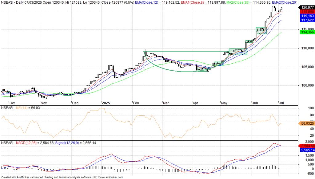 The NGX extended its rebound and markup phase at the end of the trading session heading back to its peak which was a strong resistance level of 121,264.00 basis points, while waiting for a breakout to confirm a new trend or fake-out. The continued high traded volume and the increased number of stocks making new 52-week highs indicate an inflow of funds into equity space, even when the market is still in its overbought region with strong momentum that called for cautious trading and profit booking.