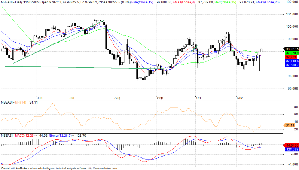 The buying sentiment in the midst of bullish hammer reversal chart pattern and retracement from resistance level of 97,975.29 basis points and 98,087.12bps, after forming a bottoming-tail and hammer candle in an uptrend. This created the perfect setup for high probability of reversal or continuation to catch end of year repositioning at the right price. Also, the index is trading above the T-line and the two moving averages of 50-EMA and 50-SMA, this indicate relatively strong momentum in the midst of changing market fundamentals and technicals on the NGX and the economy.