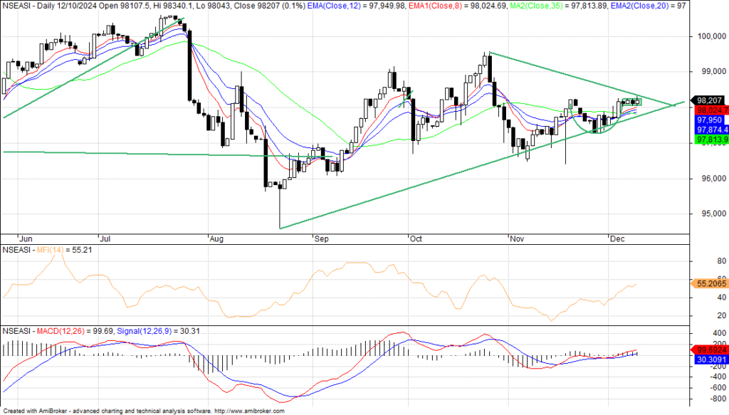 Money flow and other momentum tools were up, presenting buy opportunities for investors and traders who understand the importance of buying low and selling high in any market condition in the midst ongoing volatility. Despite, the mixed sentiment in the midst of expected breakout of resistance levels of 98,273.64 basis points and 98,340.10ps to sustain the rebound, thereby creating the perfect setup for high probability of reversal or continuation to catch end of year repositioning at the right price. Also, as the index still trade above the T-line and the two moving averages of 50-EMA and 50-SMA, this indicates relatively strength in the midst of changing market fundamentals and technicals on the NGX and the economy.