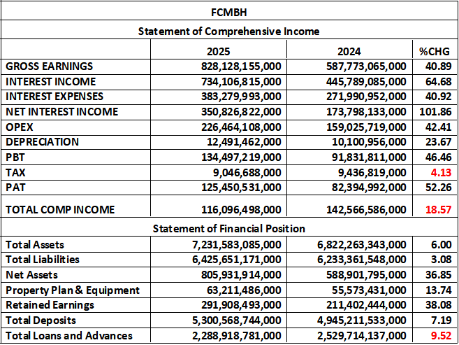 At the end of the first nine months of 2025, the Gross Earnings of FCMB Holdings stood at N828.128 billion versus N587.773 billion in the corresponding quarter. Of this, Interest Income stood at N734.106 billion against N445.789 billion in the similar period of 2024. Interest Expenses through the period was valued at N383.279 billion, versus N271.990 billion. Thus, Net Interest Income is estimated at N350.826 billion, higher than that of the corresponding period of last year by 101.86%. Operating expenses through the period is valued at N226.464 billion against N159.025 billion, while Depreciation and Amortization stood at N12.491 billion against N10.100 billion. Thus, Profit before Tax is valued at N134.497 billion against N82.394 billion in the corresponding quarter. In all, the management of FCMB Holdings announced a total of N125.450 billion as Profit for the period, 52.26% above the N82.394 billion achieved at the end of 2024 third quarter. See the table below for details: