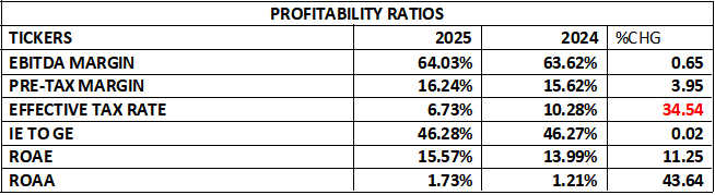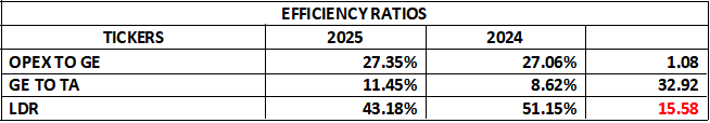 - Operating Expenses to Gross Earnings: Although this ratio increased slightly, it also reflects mild pressure. Operating Expenses consumed 27.35% of Gross Earnings, slightly higher than 27.06% in the corresponding quarter. This indicates a mild upward pressure on costs. However, the movement is very small and does not indicate a loss of cost control. In summary, efficiency is intact, but cost pressure is present and should be monitored closely.