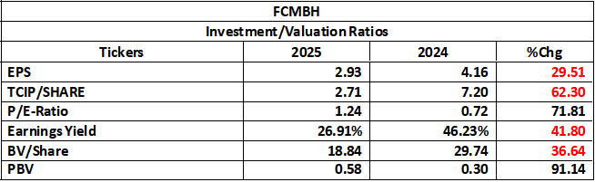 - Earnings per Share (EPS): The EPS declined as expected due to equity dilution. As shown in the table below, EPS dropped from N4.16 to N2.93 each. please note that this is not a sign of weaker performance. This is the implication of the new shares recently added. Although the number of shares increased, profit did not immediately grow at the same pace. This causes automatic EPS dilution, even when the underlying business is improving, Given the level of productivity recorded by the asset, we are of the strong opinion that EPS will recover as FCMB deploys the fresh capital more aggressively in the coming months. Thus, this decline should not be viewed negatively.