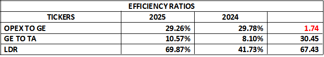 It is also important to note that: an LDR between 60%-80% is typically considered optimal, considering that the previous 41.73% was see as too conservative, meaning that large deposits were idle or deployed in lower-yield assets. In conclusion we say, the bank moved from a conservative lending stance to a more balanced and income-generating asset strategy, which aligns with improved asset productivity above.