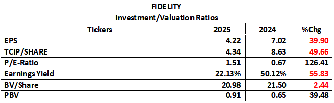 - PE-Ratio: PE rising from 0.67x to 1.51x means the market price has adjusted upward relative to earnings. Even at 1.51x, Fidelity is still extremely undervalued by global and even local standards. This means that, investors are beginning to price in the improve strength and recapitalization progress, thus, the stock is still very cheap relative to earnings.