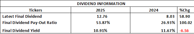 However, the final Dividend Yield declined slightly to 10.91% from 11.67%, reflecting either a higher market price of the stock, or a relatively slower growth in dividends compared to share price appreciation. This suggests that while absolute dividend payments increased, the return relative to market value weakened marginally. Overall, GTCO demonstrates a strong dividend policy with increased payouts, though the sustainability of this approach may depend on future earnings recovery.