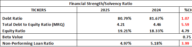 GTCO Plc’s financial strength and solvency ratios for 2025 indicate a slight improvement in its capital structure and risk profile. The debt ratio declined marginally to 80.79% from 81.67% in 2024, suggesting a modest reduction in reliance on liabilities to finance assets. Similarly, the total debt-to-equity ratio improved to 4.21 from 4.46, indicating better balance between borrowed funds and shareholders’ equity. Correspondingly, the equity ratio increased to 19.21% from 18.33%, reflecting a stronger capital base and improved capacity to absorb financial shocks. These movements collectively point to a gradual strengthening of the bank’s solvency position.