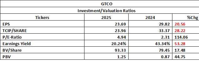 Meanwhile, capital expenditure per share increased to 3.70 from 3.10, reflecting a 19.32% growth, which indicates continued investment in infrastructure and future capacity. Overall, GTCO shows rising cost pressure and reduced asset efficiency, balanced by prudent liquidity management and sustained investment in long-term growth.