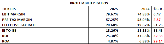 GTCO Plc’s profitability ratios for 2025 reflect mixed performance, with improvements in operating efficiency but pressure on overall returns. The EBIT margin increased to 79.67% from 74.83% in 2024, indicating stronger core earnings relative to revenue. Similarly, the pre-tax margin rose to 57.25%, suggesting improved cost management before taxation. However, the effective tax rate declined slightly to 29.68% from 19.62%, reflecting a significantly higher tax burden during the period. Interest expense to gross earnings also increased to 18.26% from 13.18%, highlighting rising funding costs which partially offset gains in operating performance.