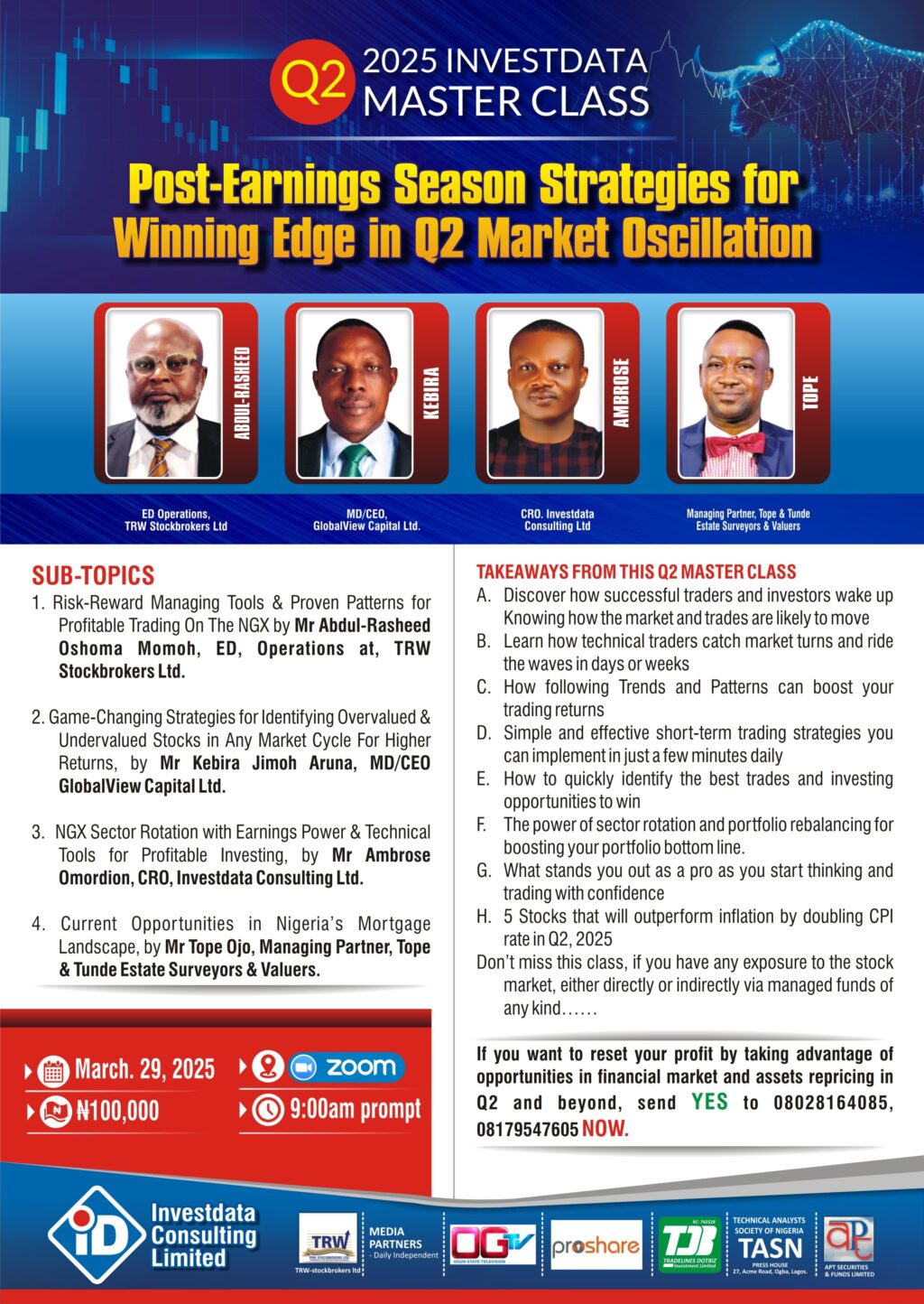 The Investdata Master Class for the 2025 Q2 holds Saturday, March 29, 2025 with the theme: “Post-Earnings Season Strategies For Winning Edge In Q2 Market Oscillation.”