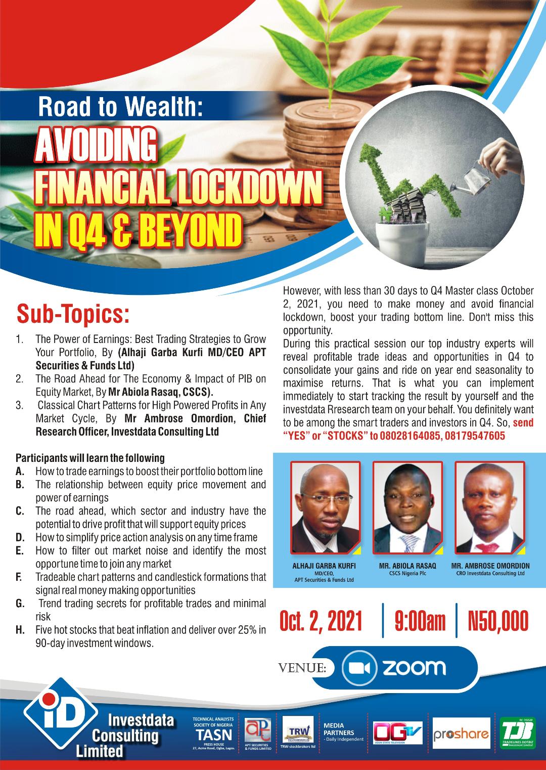 Training Investdata Master Class On How To Avoid Financial Lockdown Holds October 2 September 15, 2021 1 min read 205 Post Views: 363 Continue Reading Previous: Investdata Holds Master Class On Cash Flow For Personal Wealth CreationNext: Countdown Begins, As Investdata Master Class Holds Next Saturday Trending Now NGX Ends Bearish On Heavyweight Selloffs Amid Cautious Sentiment 1 NGX Ends Bearish On Heavyweight Selloffs Amid Cautious Sentiment January 23, 2026 Oil Slides as Geopolitical Tensions Ease, But Supply Concerns Linger 2 Oil Slides as Geopolitical Tensions Ease, But Supply Concerns Linger January 23, 2026 BUA Cement, CBMI Seal US$240m Deal For 3mtpa Sokoto Plant Expansion In 20 Months 3 BUA Cement, CBMI Seal US$240m Deal For 3mtpa Sokoto Plant Expansion In 20 Months January 22, 2026 Cautious Bargain Hunting Lifts Equities Marginally Amid Mixed Sector Performance 4 Cautious Bargain Hunting Lifts Equities Marginally Amid Mixed Sector Performance January 22, 2026 Oil Prices Tick Up On Kazakhstan Supply Disruptions 5 Oil Prices Tick Up On Kazakhstan Supply Disruptions January 22, 2026 Nigerian Equities Post Modest Rebound As Bargain Hunting, Oil Strength Support Market 6 Nigerian Equities Post Modest Rebound As Bargain Hunting, Oil Strength Support Market January 21, 2026 Related Stories Investdata To Offer Tactical Trading Strategy For Higher Returns On NGX At 2026Q1 Master Class 1 min read Training Investdata To Offer Tactical Trading Strategy For Higher Returns On NGX At 2026Q1 Master Class December 20, 2025 189 Investdata Hosts Flagship ‘Invest 2026 Traders & Investors Summit’ December 6 1 min read Training Investdata Hosts Flagship ‘Invest 2026 Traders & Investors Summit’ December 6 November 22, 2025 42 Invest 2026 Summit: Traders, Analysts To Examine Pre-Election Year Investment Opportunities, Risks 1 min read Training Invest 2026 Summit: Traders, Analysts To Examine Pre-Election Year Investment Opportunities, Risks November 15, 2025 54 Investdata Consulting Holds Q4 Master Class September 27 1 min read Training Investdata Consulting Holds Q4 Master Class September 27 September 7, 2025 43 3 min read Training June 27, 2025 157 Investdata Consulting Holds 2025Q3 Master Class June 28 1 min read Training Investdata Consulting Holds 2025Q3 Master Class June 28 June 14, 2025 95