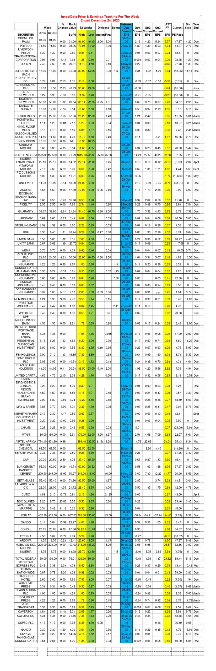 Equities Investdata Price, Earnings Track For Week Ended December 24, 2020 Editor December 26, 2020 1 min read 204 Post Views: 427 Continue Reading Previous: Expect Reversal Amidst Cautious Trading, Buying Interests In High Cap StocksNext: Corporate Actions On NGSE As Of Thursday, December 24, 2020 Trending Now NGX 2025 Year-End Review: Consumer Goods, Industrials Drive Historic 51% Surge, Set Stage For 2026 On Nigerian Bourse 1 NGX 2025 Year-End Review: Consumer Goods, Industrials Drive Historic 51% Surge, Set Stage For 2026 On Nigerian Bourse January 2, 2026 SEC Nigeria Mulls Green Energy Bonds, PPPs To Tackle National Power Sector Challenges 2 SEC Nigeria Mulls Green Energy Bonds, PPPs To Tackle National Power Sector Challenges January 1, 2026 NGX Closes 2025 Strong As Late Buying Lifts Banking Stocks, Market Breadth Improves 3 NGX Closes 2025 Strong As Late Buying Lifts Banking Stocks, Market Breadth Improves December 31, 2025 Presco Plc Says 103% Rights Issue Subscription Level Sign Of Strong Investor Confidence 4 Presco Plc Says 103% Rights Issue Subscription Level Sign Of Strong Investor Confidence December 31, 2025 Oil Prices Hold Steady On Tuesday Amid Global Tensions 5 Oil Prices Hold Steady On Tuesday Amid Global Tensions December 31, 2025 Nigerian Equities Sustain Rally As Liquidity, Sector Rotation Support Gains 6 Nigerian Equities Sustain Rally As Liquidity, Sector Rotation Support Gains December 30, 2025 Related Stories NGX 2025 Year-End Review: Consumer Goods, Industrials Drive Historic 51% Surge, Set Stage For 2026 On Nigerian Bourse 4 min read Equities NGX 2025 Year-End Review: Consumer Goods, Industrials Drive Historic 51% Surge, Set Stage For 2026 On Nigerian Bourse January 2, 2026 171 NGX Closes 2025 Strong As Late Buying Lifts Banking Stocks, Market Breadth Improves 5 min read Equities NGX Closes 2025 Strong As Late Buying Lifts Banking Stocks, Market Breadth Improves December 31, 2025 115 Nigerian Equities Sustain Rally As Liquidity, Sector Rotation Support Gains 5 min read Equities Nigerian Equities Sustain Rally As Liquidity, Sector Rotation Support Gains December 30, 2025 137 Nigerian Stocks Extend Santa Claus Rally As Composite Index Hits Fresh High 5 min read Equities Nigerian Stocks Extend Santa Claus Rally As Composite Index Hits Fresh High December 29, 2025 239 Corporate Actions On Nigerian Bourse As Of Wednesday, December 24, 2025 1 min read Equities Corporate Actions On Nigerian Bourse As Of Wednesday, December 24, 2025 December 27, 2025 195 NGX Ends Christmas Eve Higher As Banking, Consumer Stocks Advance 5 min read Equities NGX Ends Christmas Eve Higher As Banking, Consumer Stocks Advance December 24, 2025 291
