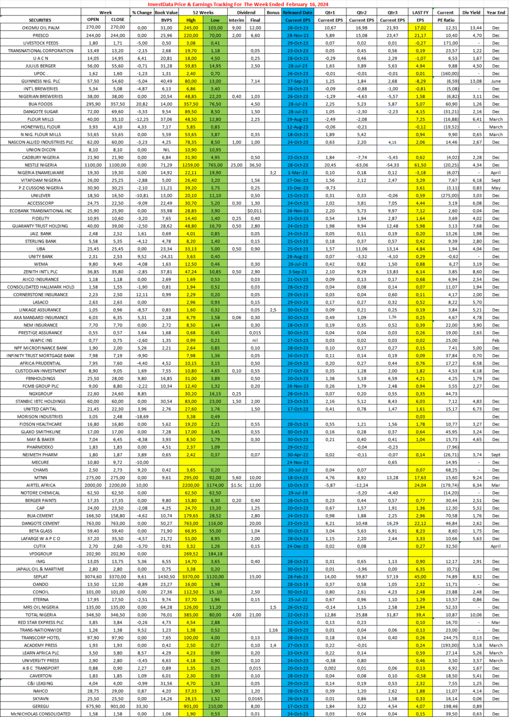 Uncategorized Investdata Price, Earnings Tracking As Of February 16, 2024 Editor February 18, 2024 1 min read 408 Post Views: 87 Continue Reading Previous: Mixed Sentiment, As Investors Position Ahead Of January Inflation Data, Earnings Inflow Next: Oil Slumps Amid U.S Inflation Data, OPEC Output Rise Trending Now NGX Ends Christmas Eve Higher As Banking, Consumer Stocks Advance 1 NGX Ends Christmas Eve Higher As Banking, Consumer Stocks Advance December 24, 2025 NGX Sustains Bullish Momentum As Buying Pressure Keeps Market On The Upside 2 NGX Sustains Bullish Momentum As Buying Pressure Keeps Market On The Upside December 23, 2025 NGX Extends Rally As Sector Rotation Persists 3 NGX Extends Rally As Sector Rotation Persists December 23, 2025 Oil Prices Edge Higher On Venezuela, Ukraine Tensions 4 Oil Prices Edge Higher On Venezuela, Ukraine Tensions December 23, 2025 SEC Nigeria Gives Capital Market Operators January 31 Deadline To Renew Registration 5 SEC Nigeria Gives Capital Market Operators January 31 Deadline To Renew Registration December 21, 2025 Investdata To Offer Tactical Trading Strategy For Higher Returns On NGX At 2026Q1 Master Class 6 Investdata To Offer Tactical Trading Strategy For Higher Returns On NGX At 2026Q1 Master Class December 20, 2025 Related Stories AFCRaises US$524m In Dual-Currency 3-Year Facility From Japanese Capital Market 2 min read Uncategorized AFCRaises US$524m In Dual-Currency 3-Year Facility From Japanese Capital Market December 3, 2025 14 UK Budget May Trigger Exodus Of Assets From Britain- deVere CEO 3 min read Uncategorized UK Budget May Trigger Exodus Of Assets From Britain- deVere CEO November 20, 2025 15 Nigerian Equities Extend Rally Amid Liquidity, Sector Rotation, Sustained Bullish Momentum 3 min read Uncategorized Nigerian Equities Extend Rally Amid Liquidity, Sector Rotation, Sustained Bullish Momentum November 14, 2025 35 Nigeria’s Non-Interest Capital Market Worth ₦1.6tr, Says SEC DG 3 min read Uncategorized Nigeria’s Non-Interest Capital Market Worth ₦1.6tr, Says SEC DG November 5, 2025 52 UK Finance Minister’s Emergency Speech Indication Tax Raises Imminent, Says deVere CEO 3 min read Uncategorized UK Finance Minister’s Emergency Speech Indication Tax Raises Imminent, Says deVere CEO November 4, 2025 14 UBA Plc Nets N537.72bn Q3 Profit, As Interest Income Up 10%, Loan Loss Charge Slip 53.93% 4 min read Uncategorized UBA Plc Nets N537.72bn Q3 Profit, As Interest Income Up 10%, Loan Loss Charge Slip 53.93% October 31, 2025 28