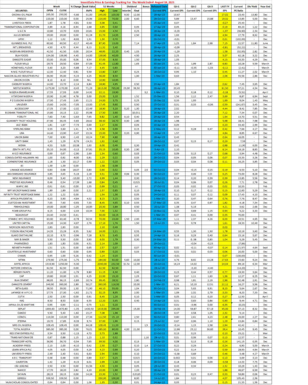 Equities Investdata Price, Earnings Tracking For The Week Ended August 18, 2023 Editor August 20, 2023 1 min read 398 Post Views: 83 Continue Reading Previous: Sentiments May Stay Mixed On Bargain Hunting, Profit Taking, As Investors Digest Economic DataNext: Mixed Sentiments Ahead Of Midweek’s TB Primary Market Auction, As Investors Opt For Sound Stocks Trending Now US Government Shutdown Fueling Anti-Dollar Trade, Expert Warns 1 US Government Shutdown Fueling Anti-Dollar Trade, Expert Warns January 30, 2026 Brent Crude Hits Six-Month High On Iran Tensions 2 Brent Crude Hits Six-Month High On Iran Tensions January 30, 2026 Recapitalisation Deadline: Nigeria’s Central Bank Hosts UK DFI, Restates Commitment To Financial Sector Reform, Long-Term Capital 3 Recapitalisation Deadline: Nigeria’s Central Bank Hosts UK DFI, Restates Commitment To Financial Sector Reform, Long-Term Capital January 30, 2026 NGX Edges Up on Renewed Investor Appetite, Strong Crude Prices 4 NGX Edges Up on Renewed Investor Appetite, Strong Crude Prices January 29, 2026 Oil Hits Four-Month High On US Storms Disruptions, Supply Concerns 5 Oil Hits Four-Month High On US Storms Disruptions, Supply Concerns January 29, 2026 Nigerian Stocks Retreat Midweek, Profit-Taking Deepens, As Market Eyes Near-Term Support 6 Nigerian Stocks Retreat Midweek, Profit-Taking Deepens, As Market Eyes Near-Term Support January 29, 2026 Related Stories NGX Edges Up on Renewed Investor Appetite, Strong Crude Prices 3 min read Equities NGX Edges Up on Renewed Investor Appetite, Strong Crude Prices January 29, 2026 123 Nigerian Stocks Retreat Midweek, Profit-Taking Deepens, As Market Eyes Near-Term Support 3 min read Equities Nigerian Stocks Retreat Midweek, Profit-Taking Deepens, As Market Eyes Near-Term Support January 29, 2026 158 NGX Closes Slightly Higher As Selective Buying Supports Market 3 min read Equities NGX Closes Slightly Higher As Selective Buying Supports Market January 28, 2026 169 NGX Consolidates As Bargain Hunting Counters Profit-Taking Amid Weak Volume 3 min read Equities NGX Consolidates As Bargain Hunting Counters Profit-Taking Amid Weak Volume January 27, 2026 169 Corporate Actions On NGX As Of Friday, January 23, 2026 1 min read Equities Corporate Actions On NGX As Of Friday, January 23, 2026 January 24, 2026 190 NGX Ends Week On Cautious Positive Note As Selective Buying Offsets Profit-Taking Pressures 3 min read Equities NGX Ends Week On Cautious Positive Note As Selective Buying Offsets Profit-Taking Pressures January 24, 2026 161