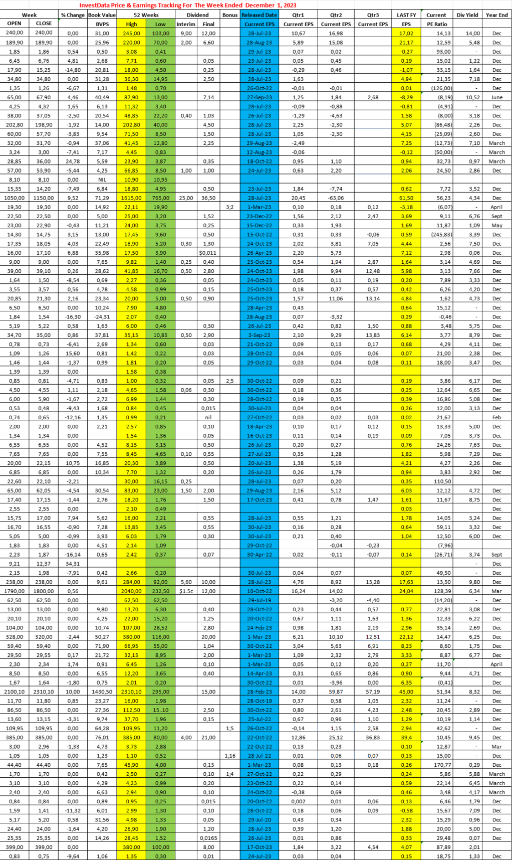 Equities Investdata Price, Earnings Tracking For The Week Ended December 1, 2023 Editor December 3, 2023 1 min read 242 Post Views: 77 Continue Reading Previous: November Closes 3.06% Up, Amid Mixed Sentiment, Bull-run, As Investors Position For Seasonal TrendsNext: Corporate Actions On NGX As Of Friday, December 1, 2023 Trending Now NGX Ends Bearish On Heavyweight Selloffs Amid Cautious Sentiment 1 NGX Ends Bearish On Heavyweight Selloffs Amid Cautious Sentiment January 23, 2026 Oil Slides as Geopolitical Tensions Ease, But Supply Concerns Linger 2 Oil Slides as Geopolitical Tensions Ease, But Supply Concerns Linger January 23, 2026 BUA Cement, CBMI Seal US$240m Deal For 3mtpa Sokoto Plant Expansion In 20 Months 3 BUA Cement, CBMI Seal US$240m Deal For 3mtpa Sokoto Plant Expansion In 20 Months January 22, 2026 Cautious Bargain Hunting Lifts Equities Marginally Amid Mixed Sector Performance 4 Cautious Bargain Hunting Lifts Equities Marginally Amid Mixed Sector Performance January 22, 2026 Oil Prices Tick Up On Kazakhstan Supply Disruptions 5 Oil Prices Tick Up On Kazakhstan Supply Disruptions January 22, 2026 Nigerian Equities Post Modest Rebound As Bargain Hunting, Oil Strength Support Market 6 Nigerian Equities Post Modest Rebound As Bargain Hunting, Oil Strength Support Market January 21, 2026 Related Stories NGX Ends Bearish On Heavyweight Selloffs Amid Cautious Sentiment 2 min read Equities NGX Ends Bearish On Heavyweight Selloffs Amid Cautious Sentiment January 23, 2026 134 Cautious Bargain Hunting Lifts Equities Marginally Amid Mixed Sector Performance 3 min read Equities Cautious Bargain Hunting Lifts Equities Marginally Amid Mixed Sector Performance January 22, 2026 146 Nigerian Equities Post Modest Rebound As Bargain Hunting, Oil Strength Support Market 3 min read Equities Nigerian Equities Post Modest Rebound As Bargain Hunting, Oil Strength Support Market January 21, 2026 189 Nigerian Equities End Flat-To-Bearish As Profit Taking Offsets Broad Buying, Composite Index Holds Key Support 3 min read Equities Nigerian Equities End Flat-To-Bearish As Profit Taking Offsets Broad Buying, Composite Index Holds Key Support January 20, 2026 195 Corporate Actions On The Nigerian Bourse As Of Friday, January 16, 2026 1 min read Equities Corporate Actions On The Nigerian Bourse As Of Friday, January 16, 2026 January 17, 2026 177 NGX Ends Week Stronger Amid Bullish Trend Despite Profit-Taking, Ahead Of Earnings Inflow 7 min read Equities NGX Ends Week Stronger Amid Bullish Trend Despite Profit-Taking, Ahead Of Earnings Inflow January 17, 2026 224