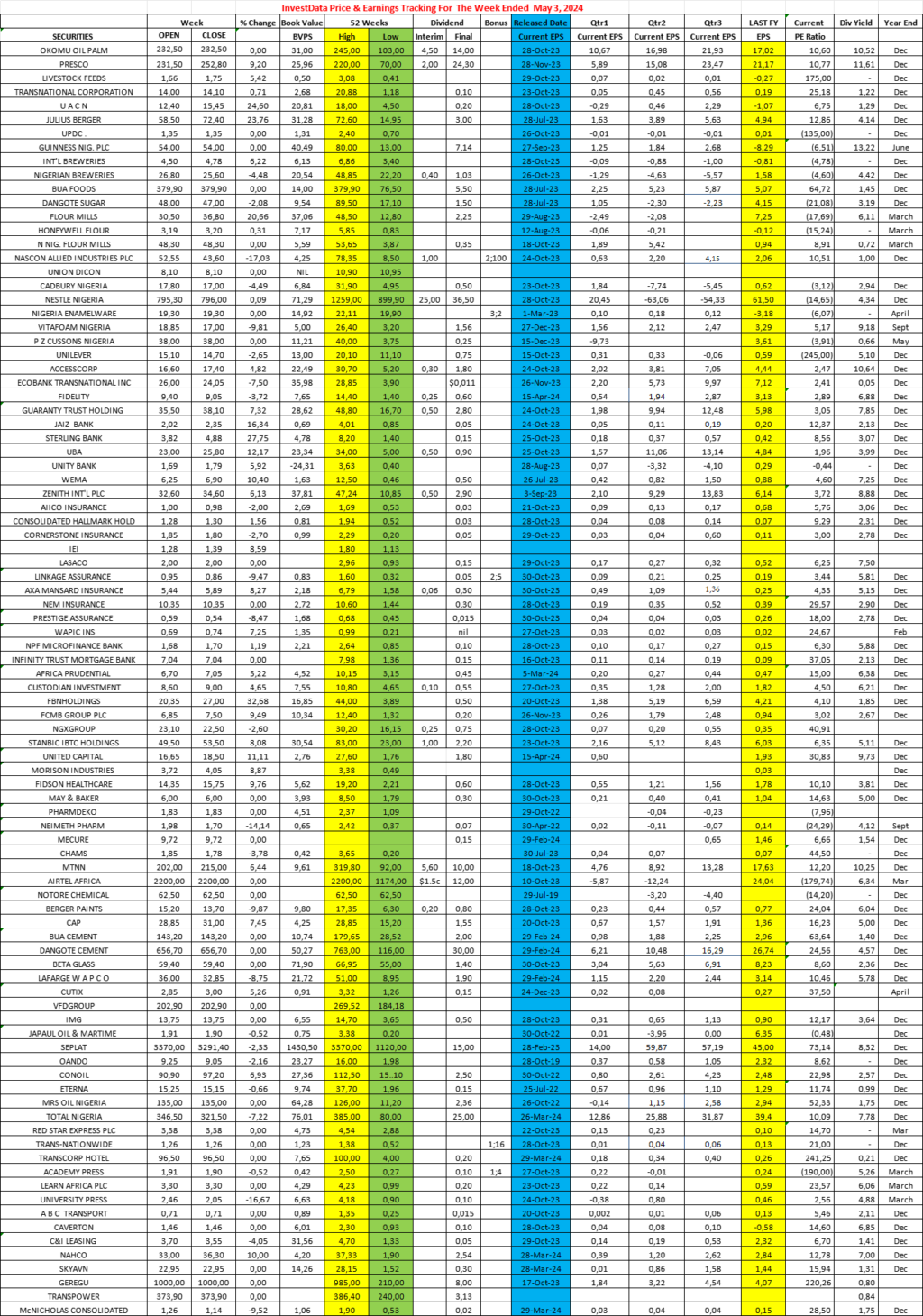 Uncategorized Investdata Price, Earnings Tracking For The Week Ended May 3, 2024 Editor May 6, 2024 1 min read 266 Post Views: 82 Continue Reading Previous: Prevailing Bearish Momentum On NGX As Golden Buy Opportunity For Discerning InvestorsNext: NGX Lists N4.075bn AVA Infrastructure Series 1 Fund Trending Now NGX Ends Christmas Eve Higher As Banking, Consumer Stocks Advance 1 NGX Ends Christmas Eve Higher As Banking, Consumer Stocks Advance December 24, 2025 NGX Sustains Bullish Momentum As Buying Pressure Keeps Market On The Upside 2 NGX Sustains Bullish Momentum As Buying Pressure Keeps Market On The Upside December 23, 2025 NGX Extends Rally As Sector Rotation Persists 3 NGX Extends Rally As Sector Rotation Persists December 23, 2025 Oil Prices Edge Higher On Venezuela, Ukraine Tensions 4 Oil Prices Edge Higher On Venezuela, Ukraine Tensions December 23, 2025 SEC Nigeria Gives Capital Market Operators January 31 Deadline To Renew Registration 5 SEC Nigeria Gives Capital Market Operators January 31 Deadline To Renew Registration December 21, 2025 Investdata To Offer Tactical Trading Strategy For Higher Returns On NGX At 2026Q1 Master Class 6 Investdata To Offer Tactical Trading Strategy For Higher Returns On NGX At 2026Q1 Master Class December 20, 2025 Related Stories AFCRaises US$524m In Dual-Currency 3-Year Facility From Japanese Capital Market 2 min read Uncategorized AFCRaises US$524m In Dual-Currency 3-Year Facility From Japanese Capital Market December 3, 2025 13 UK Budget May Trigger Exodus Of Assets From Britain- deVere CEO 3 min read Uncategorized UK Budget May Trigger Exodus Of Assets From Britain- deVere CEO November 20, 2025 15 Nigerian Equities Extend Rally Amid Liquidity, Sector Rotation, Sustained Bullish Momentum 3 min read Uncategorized Nigerian Equities Extend Rally Amid Liquidity, Sector Rotation, Sustained Bullish Momentum November 14, 2025 31 Nigeria’s Non-Interest Capital Market Worth ₦1.6tr, Says SEC DG 3 min read Uncategorized Nigeria’s Non-Interest Capital Market Worth ₦1.6tr, Says SEC DG November 5, 2025 46 UK Finance Minister’s Emergency Speech Indication Tax Raises Imminent, Says deVere CEO 3 min read Uncategorized UK Finance Minister’s Emergency Speech Indication Tax Raises Imminent, Says deVere CEO November 4, 2025 12 UBA Plc Nets N537.72bn Q3 Profit, As Interest Income Up 10%, Loan Loss Charge Slip 53.93% 4 min read Uncategorized UBA Plc Nets N537.72bn Q3 Profit, As Interest Income Up 10%, Loan Loss Charge Slip 53.93% October 31, 2025 25