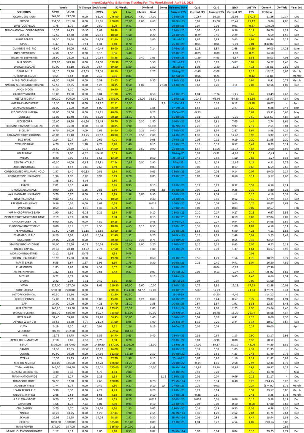Equities Investdata Price, Earnings Tracking For Week Ended April 12, 2024 Editor April 13, 2024 1 min read 289 Post Views: 88 Continue Reading Previous: Expect Fresh Positioning On Low Valuations, As Investors Review Banks’ Earnings, DividendsNext: Corporate Actions On NGX As Of Friday, April 12, 2024 Trending Now Nigerian Bourse Ranges On Profit Taking Ahead Earnings Expectations, Sector Rotation 1 Nigerian Bourse Ranges On Profit Taking Ahead Earnings Expectations, Sector Rotation January 24, 2026 Corporate Actions On NGX As Of Friday, January 23, 2026 2 Corporate Actions On NGX As Of Friday, January 23, 2026 January 24, 2026 NGX Ends Week On Cautious Positive Note As Selective Buying Offsets Profit-Taking Pressures 3 NGX Ends Week On Cautious Positive Note As Selective Buying Offsets Profit-Taking Pressures January 24, 2026 NGX Ends Bearish On Heavyweight Selloffs Amid Cautious Sentiment 4 NGX Ends Bearish On Heavyweight Selloffs Amid Cautious Sentiment January 23, 2026 Oil Slides as Geopolitical Tensions Ease, But Supply Concerns Linger 5 Oil Slides as Geopolitical Tensions Ease, But Supply Concerns Linger January 23, 2026 BUA Cement, CBMI Seal US$240m Deal For 3mtpa Sokoto Plant Expansion In 20 Months 6 BUA Cement, CBMI Seal US$240m Deal For 3mtpa Sokoto Plant Expansion In 20 Months January 22, 2026 Related Stories Corporate Actions On NGX As Of Friday, January 23, 2026 1 min read Equities Corporate Actions On NGX As Of Friday, January 23, 2026 January 24, 2026 30 NGX Ends Week On Cautious Positive Note As Selective Buying Offsets Profit-Taking Pressures 3 min read Equities NGX Ends Week On Cautious Positive Note As Selective Buying Offsets Profit-Taking Pressures January 24, 2026 39 NGX Ends Bearish On Heavyweight Selloffs Amid Cautious Sentiment 2 min read Equities NGX Ends Bearish On Heavyweight Selloffs Amid Cautious Sentiment January 23, 2026 138 Cautious Bargain Hunting Lifts Equities Marginally Amid Mixed Sector Performance 3 min read Equities Cautious Bargain Hunting Lifts Equities Marginally Amid Mixed Sector Performance January 22, 2026 148 Nigerian Equities Post Modest Rebound As Bargain Hunting, Oil Strength Support Market 3 min read Equities Nigerian Equities Post Modest Rebound As Bargain Hunting, Oil Strength Support Market January 21, 2026 190 Nigerian Equities End Flat-To-Bearish As Profit Taking Offsets Broad Buying, Composite Index Holds Key Support 3 min read Equities Nigerian Equities End Flat-To-Bearish As Profit Taking Offsets Broad Buying, Composite Index Holds Key Support January 20, 2026 195