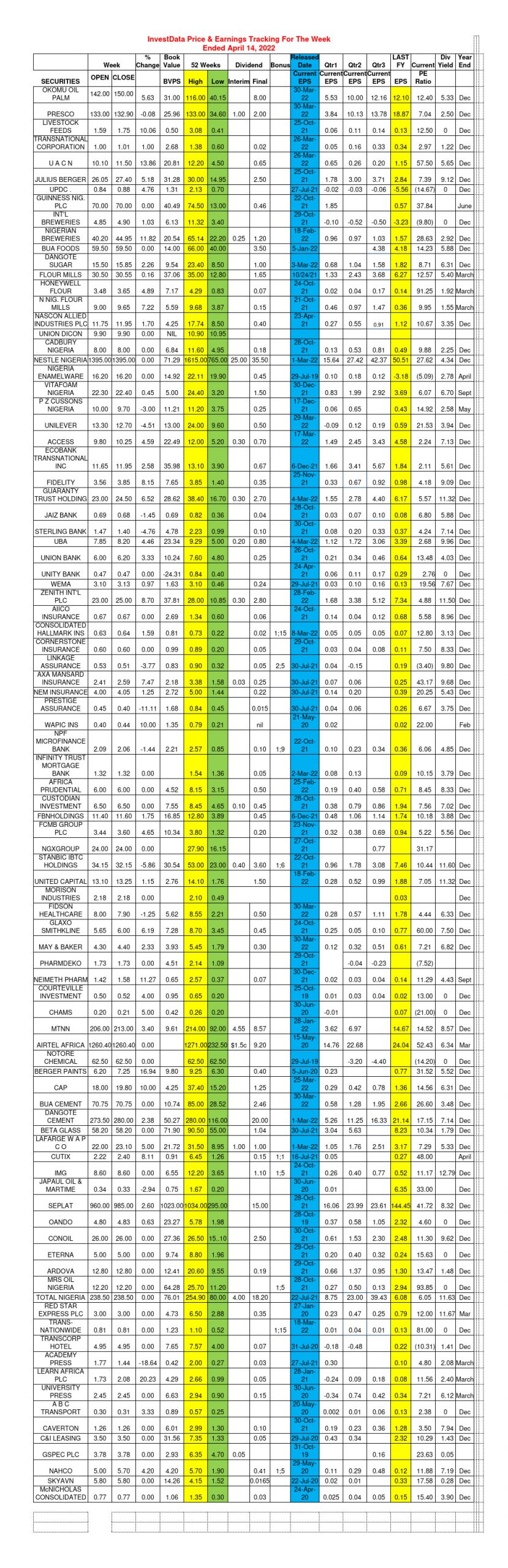 Equities Investdata Price, Earnings Tracking For Week Ended April 14, 2022 April 17, 2022 1 min read 645 Post Views: 276 Continue Reading Previous: Expect Mixed Sentiments, Trends, Amid Profit-Taking, Reactions To Q1 EarningsNext: Corporate Actions On NGX Exchange As Of Thursday, April 14, 2022 Trending Now GDP: Nigeria Operating Far Below Its Productive Capacity 1 GDP: Nigeria Operating Far Below Its Productive Capacity January 25, 2026 Nigerian Bourse Ranges On Profit Taking Ahead Earnings Expectations, Sector Rotation 2 Nigerian Bourse Ranges On Profit Taking Ahead Earnings Expectations, Sector Rotation January 24, 2026 Corporate Actions On NGX As Of Friday, January 23, 2026 3 Corporate Actions On NGX As Of Friday, January 23, 2026 January 24, 2026 NGX Ends Week On Cautious Positive Note As Selective Buying Offsets Profit-Taking Pressures 4 NGX Ends Week On Cautious Positive Note As Selective Buying Offsets Profit-Taking Pressures January 24, 2026 NGX Ends Bearish On Heavyweight Selloffs Amid Cautious Sentiment 5 NGX Ends Bearish On Heavyweight Selloffs Amid Cautious Sentiment January 23, 2026 Oil Slides as Geopolitical Tensions Ease, But Supply Concerns Linger 6 Oil Slides as Geopolitical Tensions Ease, But Supply Concerns Linger January 23, 2026 Related Stories Corporate Actions On NGX As Of Friday, January 23, 2026 1 min read Equities Corporate Actions On NGX As Of Friday, January 23, 2026 January 24, 2026 69 NGX Ends Week On Cautious Positive Note As Selective Buying Offsets Profit-Taking Pressures 3 min read Equities NGX Ends Week On Cautious Positive Note As Selective Buying Offsets Profit-Taking Pressures January 24, 2026 80 NGX Ends Bearish On Heavyweight Selloffs Amid Cautious Sentiment 2 min read Equities NGX Ends Bearish On Heavyweight Selloffs Amid Cautious Sentiment January 23, 2026 165 Cautious Bargain Hunting Lifts Equities Marginally Amid Mixed Sector Performance 3 min read Equities Cautious Bargain Hunting Lifts Equities Marginally Amid Mixed Sector Performance January 22, 2026 170 Nigerian Equities Post Modest Rebound As Bargain Hunting, Oil Strength Support Market 3 min read Equities Nigerian Equities Post Modest Rebound As Bargain Hunting, Oil Strength Support Market January 21, 2026 191 Nigerian Equities End Flat-To-Bearish As Profit Taking Offsets Broad Buying, Composite Index Holds Key Support 3 min read Equities Nigerian Equities End Flat-To-Bearish As Profit Taking Offsets Broad Buying, Composite Index Holds Key Support January 20, 2026 195