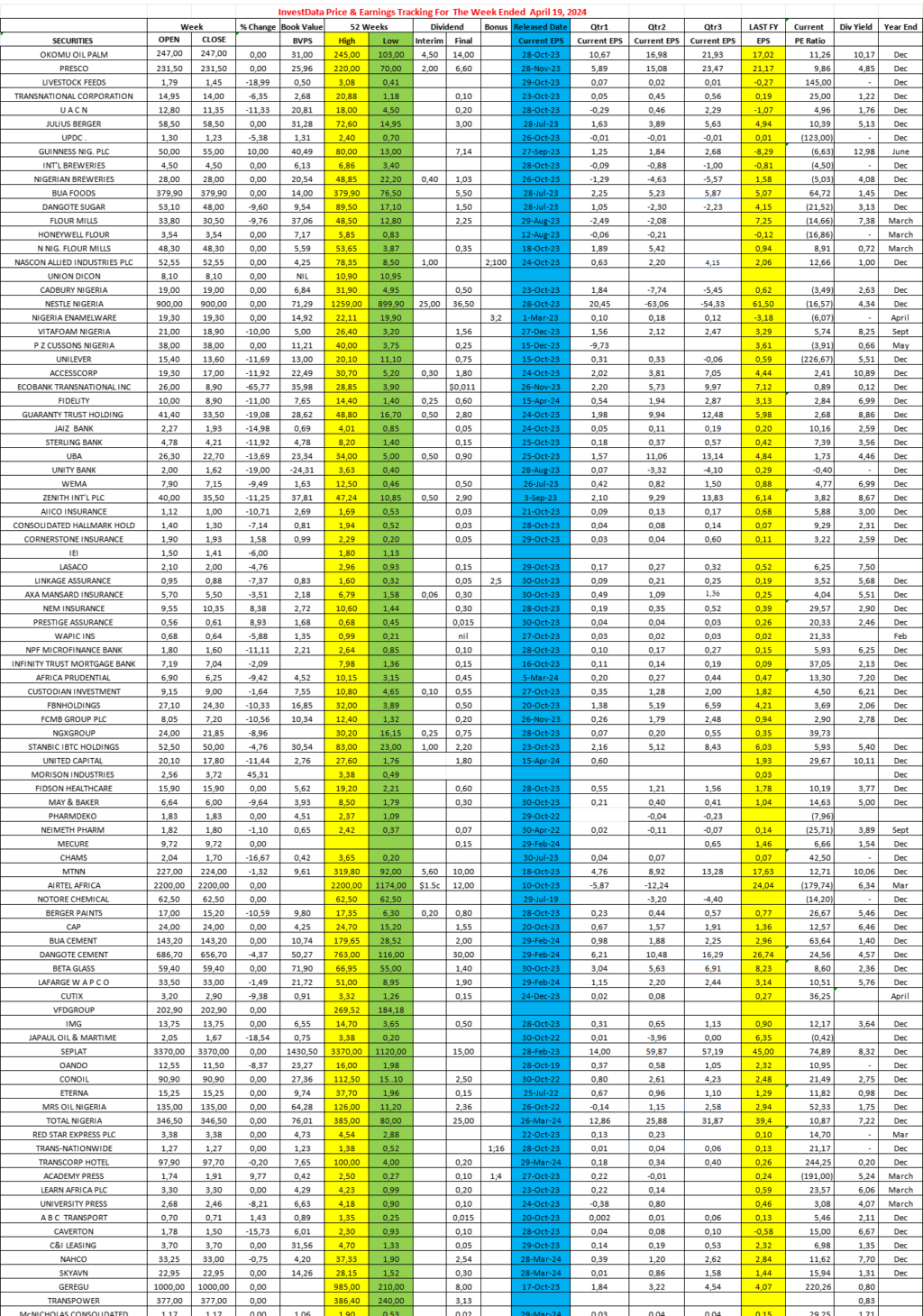 Equities Investdata Price, Earnings Tracking For Week Ended April 19, 2024 Editor April 21, 2024 1 min read 301 Post Views: 139 Continue Reading Previous: Bearish Sentiments Yet, As Bank Recapitalisation Gathers Steam, Investors Position On PullbacksNext: Corporate Actions On NGX As Of Friday, April 19, 2024 Trending Now Oil Holds Steady Amid Geopolitical Risks, Surplus Outlook 1 Oil Holds Steady Amid Geopolitical Risks, Surplus Outlook December 16, 2025 NGX Edges Higher Amid Selective Buying, Market Consolidates Near Recent Highs 2 NGX Edges Higher Amid Selective Buying, Market Consolidates Near Recent Highs December 15, 2025 BUA Group Doles Out ₦30bn Cash Awards To 510 Employees 3 BUA Group Doles Out ₦30bn Cash Awards To 510 Employees December 15, 2025 Oil Prices Slide On Oversupply Concerns, Post 4% Weekly Loss 4 Oil Prices Slide On Oversupply Concerns, Post 4% Weekly Loss December 15, 2025 Nigerian Index Extends Two-Week Strong Buying Interests On Low Cap Stocks, Blue-Chip Gains 5 Nigerian Index Extends Two-Week Strong Buying Interests On Low Cap Stocks, Blue-Chip Gains December 13, 2025 Corporate Actions On NGX As Of Friday, December 11, 2025 6 Corporate Actions On NGX As Of Friday, December 11, 2025 December 13, 2025 Related Stories NGX Edges Higher Amid Selective Buying, Market Consolidates Near Recent Highs 3 min read Equities NGX Edges Higher Amid Selective Buying, Market Consolidates Near Recent Highs December 15, 2025 97 Corporate Actions On NGX As Of Friday, December 11, 2025 1 min read Equities Corporate Actions On NGX As Of Friday, December 11, 2025 December 13, 2025 116 Nigerian Bourse Rebounds Strongly, Index Gains 0.74% Amid Broad-Based Buying, Market Outlook Turns Firmer 3 min read Equities Nigerian Bourse Rebounds Strongly, Index Gains 0.74% Amid Broad-Based Buying, Market Outlook Turns Firmer December 11, 2025 128 NGX Index Slips Again As Broad Profit-Taking Persists, Investors Brace For Year-End Rebalancing 3 min read Equities NGX Index Slips Again As Broad Profit-Taking Persists, Investors Brace For Year-End Rebalancing December 10, 2025 65 Nigeria’s NGX Slips As Profit Taking Halts Rally Amid Cautious Investor Sentiments 3 min read Equities Nigeria’s NGX Slips As Profit Taking Halts Rally Amid Cautious Investor Sentiments December 9, 2025 36 Nigeria’s NGX Opens Week Strong As Bulls Tighten Grip, Banking Stocks Lead Momentum 4 min read Equities Nigeria’s NGX Opens Week Strong As Bulls Tighten Grip, Banking Stocks Lead Momentum December 9, 2025 16