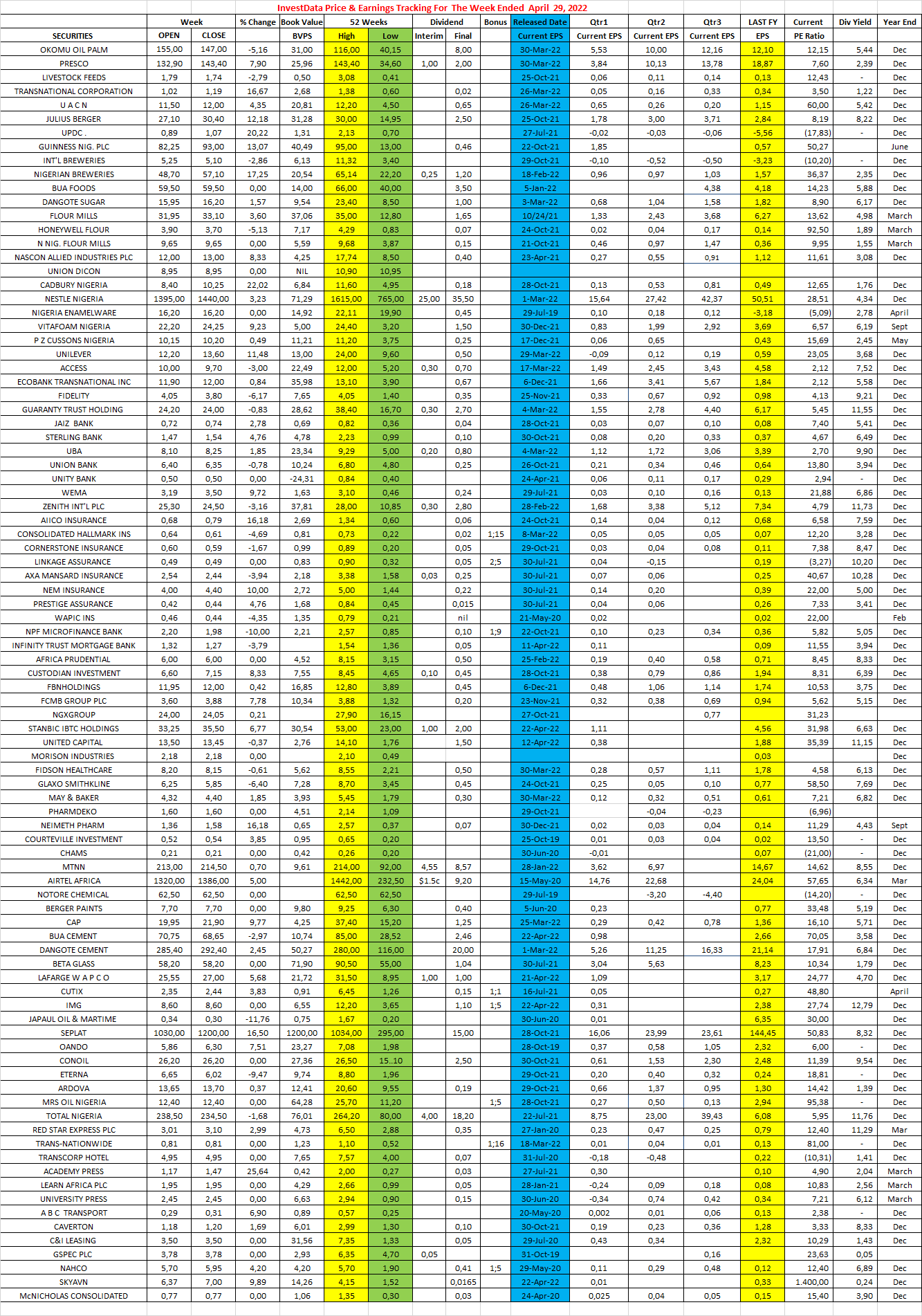 Equities Investdata Price, Earnings Tracking For Week Ended April 29, 2022 April 30, 2022 1 min read 246 Post Views: 402 Continue Reading Previous: Expect Continued Positive Trend, Amid Month-end Portfolio Balancing, On Q1 Earnings InfluxNext: Corporate Actions On NGX Exchange As Of Week Ended Friday, April 29, 2022 Trending Now Vitafoam Nigeria: Robust Medium, Long-Term Investors, Amid Sustainability Concerns 1 Vitafoam Nigeria: Robust Medium, Long-Term Investors, Amid Sustainability Concerns January 10, 2026 Investors On Alert Amid Speculation Over Trump’s Greenland Plans 2 Investors On Alert Amid Speculation Over Trump’s Greenland Plans January 9, 2026 Weak US Jobs Report forces Fed To Hasten Rate Cuts- deVere CEO 3 Weak US Jobs Report forces Fed To Hasten Rate Cuts- deVere CEO January 9, 2026 NGX Ends Week Firmly Higher As Broad Buying, New 52-Week Highs Sustain Bullish Momentum 4 NGX Ends Week Firmly Higher As Broad Buying, New 52-Week Highs Sustain Bullish Momentum January 9, 2026 Cautious Buying In Healthcare Pushes Nigerian Exchange Higher Amid Declining Market Activity 5 Cautious Buying In Healthcare Pushes Nigerian Exchange Higher Amid Declining Market Activity January 8, 2026 Nigerian Bourse Pushes Higher On Selective Accumulation As Breakout Stocks Dominate, Cautious Sentiment Lingers 6 Nigerian Bourse Pushes Higher On Selective Accumulation As Breakout Stocks Dominate, Cautious Sentiment Lingers January 7, 2026 Related Stories NGX Ends Week Firmly Higher As Broad Buying, New 52-Week Highs Sustain Bullish Momentum 3 min read Equities NGX Ends Week Firmly Higher As Broad Buying, New 52-Week Highs Sustain Bullish Momentum January 9, 2026 85 Cautious Buying In Healthcare Pushes Nigerian Exchange Higher Amid Declining Market Activity 2 min read Equities Cautious Buying In Healthcare Pushes Nigerian Exchange Higher Amid Declining Market Activity January 8, 2026 222 Nigerian Bourse Pushes Higher On Selective Accumulation As Breakout Stocks Dominate, Cautious Sentiment Lingers 3 min read Equities Nigerian Bourse Pushes Higher On Selective Accumulation As Breakout Stocks Dominate, Cautious Sentiment Lingers January 7, 2026 179 NGX Rally Deepens As Broad-Based Buying, Sector Rotation, Steady Oil Prices Shape Early 2026 Trade 3 min read Equities NGX Rally Deepens As Broad-Based Buying, Sector Rotation, Steady Oil Prices Shape Early 2026 Trade January 5, 2026 404 Corporate Actions On Nigerian Bourse As Of Friday, January 2, 2026 1 min read Equities Corporate Actions On Nigerian Bourse As Of Friday, January 2, 2026 January 4, 2026 143 NGX Begins 2026 On Strong Footing As Selective Buying Lifts Banking, Mid-Cap Stocks 2 min read Equities NGX Begins 2026 On Strong Footing As Selective Buying Lifts Banking, Mid-Cap Stocks January 3, 2026 243