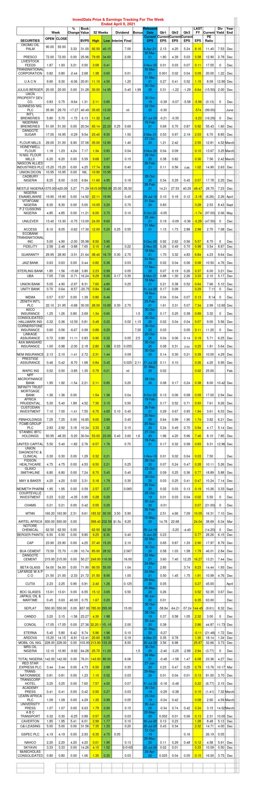 Equities Investdata Price, Earnings Tracking For Week Ended April 9, 2021 Editor April 10, 2021 1 min read 141 Post Views: 309 Continue Reading Previous: Strong Recovery Ahead On Market Forces, 2020 Full-Year, 2021Q1 NumbersNext: Corporate Actions On NGSE As Of Friday, April 9, 2021 Trending Now NGX 2025 Year-End Review: Consumer Goods, Industrials Drive Historic 51% Surge, Set Stage For 2026 On Nigerian Bourse 1 NGX 2025 Year-End Review: Consumer Goods, Industrials Drive Historic 51% Surge, Set Stage For 2026 On Nigerian Bourse January 2, 2026 SEC Nigeria Mulls Green Energy Bonds, PPPs To Tackle National Power Sector Challenges 2 SEC Nigeria Mulls Green Energy Bonds, PPPs To Tackle National Power Sector Challenges January 1, 2026 NGX Closes 2025 Strong As Late Buying Lifts Banking Stocks, Market Breadth Improves 3 NGX Closes 2025 Strong As Late Buying Lifts Banking Stocks, Market Breadth Improves December 31, 2025 Presco Plc Says 103% Rights Issue Subscription Level Sign Of Strong Investor Confidence 4 Presco Plc Says 103% Rights Issue Subscription Level Sign Of Strong Investor Confidence December 31, 2025 Oil Prices Hold Steady On Tuesday Amid Global Tensions 5 Oil Prices Hold Steady On Tuesday Amid Global Tensions December 31, 2025 Nigerian Equities Sustain Rally As Liquidity, Sector Rotation Support Gains 6 Nigerian Equities Sustain Rally As Liquidity, Sector Rotation Support Gains December 30, 2025 Related Stories NGX 2025 Year-End Review: Consumer Goods, Industrials Drive Historic 51% Surge, Set Stage For 2026 On Nigerian Bourse 4 min read Equities NGX 2025 Year-End Review: Consumer Goods, Industrials Drive Historic 51% Surge, Set Stage For 2026 On Nigerian Bourse January 2, 2026 30 NGX Closes 2025 Strong As Late Buying Lifts Banking Stocks, Market Breadth Improves 5 min read Equities NGX Closes 2025 Strong As Late Buying Lifts Banking Stocks, Market Breadth Improves December 31, 2025 93 Nigerian Equities Sustain Rally As Liquidity, Sector Rotation Support Gains 5 min read Equities Nigerian Equities Sustain Rally As Liquidity, Sector Rotation Support Gains December 30, 2025 122 Nigerian Stocks Extend Santa Claus Rally As Composite Index Hits Fresh High 5 min read Equities Nigerian Stocks Extend Santa Claus Rally As Composite Index Hits Fresh High December 29, 2025 231 Corporate Actions On Nigerian Bourse As Of Wednesday, December 24, 2025 1 min read Equities Corporate Actions On Nigerian Bourse As Of Wednesday, December 24, 2025 December 27, 2025 181 NGX Ends Christmas Eve Higher As Banking, Consumer Stocks Advance 5 min read Equities NGX Ends Christmas Eve Higher As Banking, Consumer Stocks Advance December 24, 2025 289