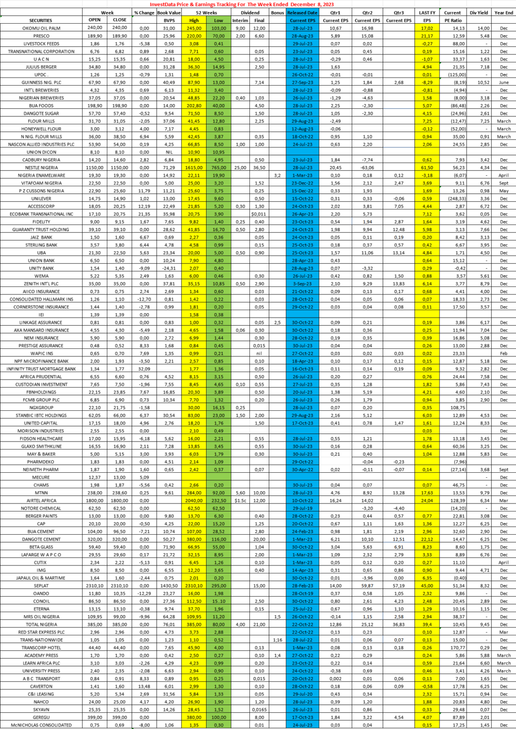 Equities Investdata Price, Earnings Tracking For Week Ended December 8, 2023 Editor December 9, 2023 1 min read 282 Post Views: 115 Continue Reading Previous: Mixed Trend, Profit Taking Ahead Of Year-end Seasonality On Bargain Hunting For Dividend StocksNext: Corporate Actions On NGX As Of Friday, December 8, 2023 Trending Now NGX Ends Christmas Eve Higher As Banking, Consumer Stocks Advance 1 NGX Ends Christmas Eve Higher As Banking, Consumer Stocks Advance December 24, 2025 NGX Sustains Bullish Momentum As Buying Pressure Keeps Market On The Upside 2 NGX Sustains Bullish Momentum As Buying Pressure Keeps Market On The Upside December 23, 2025 NGX Extends Rally As Sector Rotation Persists 3 NGX Extends Rally As Sector Rotation Persists December 23, 2025 Oil Prices Edge Higher On Venezuela, Ukraine Tensions 4 Oil Prices Edge Higher On Venezuela, Ukraine Tensions December 23, 2025 SEC Nigeria Gives Capital Market Operators January 31 Deadline To Renew Registration 5 SEC Nigeria Gives Capital Market Operators January 31 Deadline To Renew Registration December 21, 2025 Investdata To Offer Tactical Trading Strategy For Higher Returns On NGX At 2026Q1 Master Class 6 Investdata To Offer Tactical Trading Strategy For Higher Returns On NGX At 2026Q1 Master Class December 20, 2025 Related Stories NGX Ends Christmas Eve Higher As Banking, Consumer Stocks Advance 5 min read Equities NGX Ends Christmas Eve Higher As Banking, Consumer Stocks Advance December 24, 2025 103 NGX Sustains Bullish Momentum As Buying Pressure Keeps Market On The Upside 5 min read Equities NGX Sustains Bullish Momentum As Buying Pressure Keeps Market On The Upside December 23, 2025 126 NGX Extends Rally As Sector Rotation Persists 5 min read Equities NGX Extends Rally As Sector Rotation Persists December 23, 2025 128 Corporate Actions On NGX As Of Friday, December 19, 2025 1 min read Equities Corporate Actions On NGX As Of Friday, December 19, 2025 December 20, 2025 125 NGX Stretches Winning Streak To Seven Sessions As Broad Buying Keeps Bulls In Control 3 min read Equities NGX Stretches Winning Streak To Seven Sessions As Broad Buying Keeps Bulls In Control December 19, 2025 208 NGX Maintains Uptrend As Investors Accumulate Blue Chips Despite Slower Trading Activity 3 min read Equities NGX Maintains Uptrend As Investors Accumulate Blue Chips Despite Slower Trading Activity December 18, 2025 187