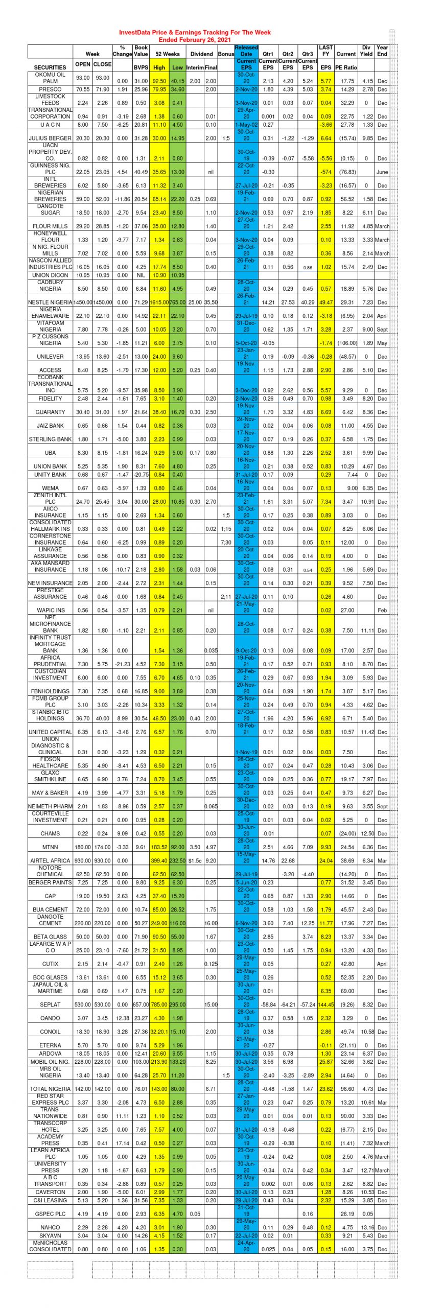 Equities Investdata Price, Earnings Tracking For Week Ended February 26, 2021 Editor February 27, 2021 1 min read 195 Post Views: 327 Continue Reading Previous: Mixed Trend May Linger Yet, As Bargain Hunters Position On Sustained PullbacksNext: Corporate Actions On NGSE As Of Friday, February 26, 2021 Trending Now NGX Closes Week Strong As Blue Chips Drive Composite Index Higher 1 NGX Closes Week Strong As Blue Chips Drive Composite Index Higher February 13, 2026 Oil Prices Fall On Weaker Demand, Rising Supply 2 Oil Prices Fall On Weaker Demand, Rising Supply February 13, 2026 Nigeria’s Equity Market Maintains Bullish Bias As Selective Buying Drives Gains 3 Nigeria’s Equity Market Maintains Bullish Bias As Selective Buying Drives Gains February 13, 2026 Oil Gains As U.S.–Iran Tensions Offset Inventory Surge 4 Oil Gains As U.S.–Iran Tensions Offset Inventory Surge February 12, 2026 Bullish Momentum Persists As NGX Extends Winning Streak 5 Bullish Momentum Persists As NGX Extends Winning Streak February 12, 2026 Delayed: Nigerian Bourse Rally Persists as Benchmark Index Gains 1.65% 6 Delayed: Nigerian Bourse Rally Persists as Benchmark Index Gains 1.65% February 11, 2026 Related Stories NGX Closes Week Strong As Blue Chips Drive Composite Index Higher 3 min read Equities NGX Closes Week Strong As Blue Chips Drive Composite Index Higher February 13, 2026 96 Nigeria’s Equity Market Maintains Bullish Bias As Selective Buying Drives Gains 3 min read Equities Nigeria’s Equity Market Maintains Bullish Bias As Selective Buying Drives Gains February 13, 2026 90 Oil Gains As U.S.–Iran Tensions Offset Inventory Surge 2 min read Equities Oil Gains As U.S.–Iran Tensions Offset Inventory Surge February 12, 2026 88 Bullish Momentum Persists As NGX Extends Winning Streak 3 min read Equities Bullish Momentum Persists As NGX Extends Winning Streak February 12, 2026 111 Delayed: Nigerian Bourse Rally Persists as Benchmark Index Gains 1.65% 4 min read Equities Delayed: Nigerian Bourse Rally Persists as Benchmark Index Gains 1.65% February 11, 2026 144 Corporate Actions On Nigerian Bourse As Of February 6, 2026 1 min read Equities Corporate Actions On Nigerian Bourse As Of February 6, 2026 February 9, 2026 157