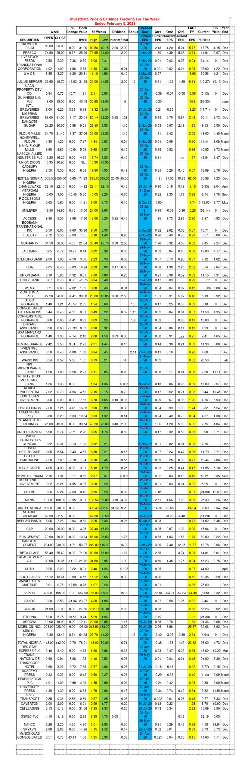 Equities Investdata Price, Earnings Tracking For Week Ended February 5, 2021 Editor February 6, 2021 1 min read 172 Post Views: 329 Continue Reading Previous: Amidst Losses, Better Yields, NGSE Becomes More Attractive For PositioningNext: Corporate Actions On NGSE As Of Friday, February 5, 2021 Trending Now NGX 2025 Year-End Review: Consumer Goods, Industrials Drive Historic 51% Surge, Set Stage For 2026 On Nigerian Bourse 1 NGX 2025 Year-End Review: Consumer Goods, Industrials Drive Historic 51% Surge, Set Stage For 2026 On Nigerian Bourse January 2, 2026 SEC Nigeria Mulls Green Energy Bonds, PPPs To Tackle National Power Sector Challenges 2 SEC Nigeria Mulls Green Energy Bonds, PPPs To Tackle National Power Sector Challenges January 1, 2026 NGX Closes 2025 Strong As Late Buying Lifts Banking Stocks, Market Breadth Improves 3 NGX Closes 2025 Strong As Late Buying Lifts Banking Stocks, Market Breadth Improves December 31, 2025 Presco Plc Says 103% Rights Issue Subscription Level Sign Of Strong Investor Confidence 4 Presco Plc Says 103% Rights Issue Subscription Level Sign Of Strong Investor Confidence December 31, 2025 Oil Prices Hold Steady On Tuesday Amid Global Tensions 5 Oil Prices Hold Steady On Tuesday Amid Global Tensions December 31, 2025 Nigerian Equities Sustain Rally As Liquidity, Sector Rotation Support Gains 6 Nigerian Equities Sustain Rally As Liquidity, Sector Rotation Support Gains December 30, 2025 Related Stories NGX 2025 Year-End Review: Consumer Goods, Industrials Drive Historic 51% Surge, Set Stage For 2026 On Nigerian Bourse 4 min read Equities NGX 2025 Year-End Review: Consumer Goods, Industrials Drive Historic 51% Surge, Set Stage For 2026 On Nigerian Bourse January 2, 2026 38 NGX Closes 2025 Strong As Late Buying Lifts Banking Stocks, Market Breadth Improves 5 min read Equities NGX Closes 2025 Strong As Late Buying Lifts Banking Stocks, Market Breadth Improves December 31, 2025 94 Nigerian Equities Sustain Rally As Liquidity, Sector Rotation Support Gains 5 min read Equities Nigerian Equities Sustain Rally As Liquidity, Sector Rotation Support Gains December 30, 2025 122 Nigerian Stocks Extend Santa Claus Rally As Composite Index Hits Fresh High 5 min read Equities Nigerian Stocks Extend Santa Claus Rally As Composite Index Hits Fresh High December 29, 2025 232 Corporate Actions On Nigerian Bourse As Of Wednesday, December 24, 2025 1 min read Equities Corporate Actions On Nigerian Bourse As Of Wednesday, December 24, 2025 December 27, 2025 181 NGX Ends Christmas Eve Higher As Banking, Consumer Stocks Advance 5 min read Equities NGX Ends Christmas Eve Higher As Banking, Consumer Stocks Advance December 24, 2025 289