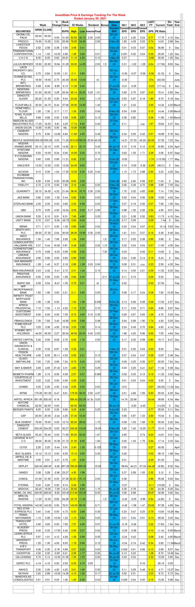 Equities Investdata Price, Earnings Tracking For Week Ended January 29, 2021 Editor January 30, 2021 1 min read 125 Post Views: 358 Continue Reading Previous: Roundup: Insurance, Oil & Gas Indices Drive NSEASI Up, As Market Cap Gains 5.37% In JanuaryNext: Corporate Actions As Of Friday, January 29, 2021 Trending Now SEC Nigeria Gives Capital Market Operators January 31 Deadline To Renew Registration 1 SEC Nigeria Gives Capital Market Operators January 31 Deadline To Renew Registration December 21, 2025 Investdata To Offer Tactical Trading Strategy For Higher Returns On NGX At 2026Q1 Master Class 2 Investdata To Offer Tactical Trading Strategy For Higher Returns On NGX At 2026Q1 Master Class December 20, 2025 Corporate Actions On NGX As Of Friday, December 19, 2025 3 Corporate Actions On NGX As Of Friday, December 19, 2025 December 20, 2025 Strong Buying Momentum Lifts NGX Index Above 152,000 Psychological Line On Heavy Volume 4 Strong Buying Momentum Lifts NGX Index Above 152,000 Psychological Line On Heavy Volume December 20, 2025 NGX Stretches Winning Streak To Seven Sessions As Broad Buying Keeps Bulls In Control 5 NGX Stretches Winning Streak To Seven Sessions As Broad Buying Keeps Bulls In Control December 19, 2025 Otedola Raises First HoldCo Plc Stake To 17.04% In Latest Deals 6 Otedola Raises First HoldCo Plc Stake To 17.04% In Latest Deals December 19, 2025 Related Stories Corporate Actions On NGX As Of Friday, December 19, 2025 1 min read Equities Corporate Actions On NGX As Of Friday, December 19, 2025 December 20, 2025 71 NGX Stretches Winning Streak To Seven Sessions As Broad Buying Keeps Bulls In Control 3 min read Equities NGX Stretches Winning Streak To Seven Sessions As Broad Buying Keeps Bulls In Control December 19, 2025 167 NGX Maintains Uptrend As Investors Accumulate Blue Chips Despite Slower Trading Activity 3 min read Equities NGX Maintains Uptrend As Investors Accumulate Blue Chips Despite Slower Trading Activity December 18, 2025 168 Cautious Buying Persists As Select Stocks Drive Marginal Market Upside 4 min read Equities Cautious Buying Persists As Select Stocks Drive Marginal Market Upside December 16, 2025 116 NGX Edges Higher Amid Selective Buying, Market Consolidates Near Recent Highs 3 min read Equities NGX Edges Higher Amid Selective Buying, Market Consolidates Near Recent Highs December 15, 2025 169 Corporate Actions On NGX As Of Friday, December 11, 2025 1 min read Equities Corporate Actions On NGX As Of Friday, December 11, 2025 December 13, 2025 201