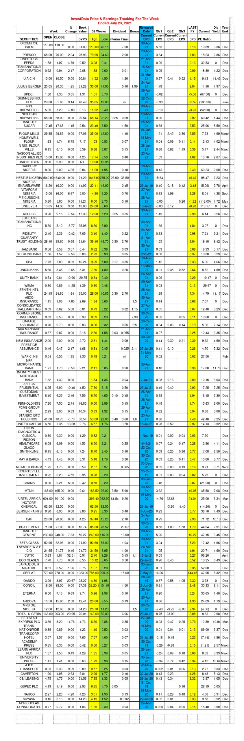 Equities Investdata Price, Earnings Tracking For Week Ended July 23, 2021 July 24, 2021 1 min read 276 Post Views: 345 Continue Reading Previous: Mixed Trend Ahead On Profit-Taking, Renewed Buying Interests, H1 Earnings, MPC MeetingNext: Corporate Actions On NGX As Of Friday, July 23, 2021 Trending Now Nigerian Bourse Ends Winning Streak As Profit-Taking Triggers First Loss Of 2026 1 Nigerian Bourse Ends Winning Streak As Profit-Taking Triggers First Loss Of 2026 January 15, 2026 Oil Prices Edge Higher On Iran Risk 2 Oil Prices Edge Higher On Iran Risk January 15, 2026 NGX Midweek Rally Strengthens On Oil Gains, Banking Sector Support 3 NGX Midweek Rally Strengthens On Oil Gains, Banking Sector Support January 15, 2026 deVere CEO Says U.S Supreme Court Silence On Trump Tariffs Extends Market Risk 4 deVere CEO Says U.S Supreme Court Silence On Trump Tariffs Extends Market Risk January 14, 2026 Silver Hits Record High, $200 next? 5 Silver Hits Record High, $200 next? January 14, 2026 Oil Prices Rise As Iran Unrest Lifts Geopolitical Risk Premium 6 Oil Prices Rise As Iran Unrest Lifts Geopolitical Risk Premium January 14, 2026 Related Stories Nigerian Bourse Ends Winning Streak As Profit-Taking Triggers First Loss Of 2026 3 min read Equities Nigerian Bourse Ends Winning Streak As Profit-Taking Triggers First Loss Of 2026 January 15, 2026 28 NGX Midweek Rally Strengthens On Oil Gains, Banking Sector Support 3 min read Equities NGX Midweek Rally Strengthens On Oil Gains, Banking Sector Support January 15, 2026 149 Nigerian Equities Power Higher As Strong Demand Drives Broad-Based Rally 3 min read Equities Nigerian Equities Power Higher As Strong Demand Drives Broad-Based Rally January 14, 2026 136 Nigerian Equities Extend Rally As Composite Index Adds 58bps On Broad-Based Buying 3 min read Equities Nigerian Equities Extend Rally As Composite Index Adds 58bps On Broad-Based Buying January 12, 2026 191 Corporate Actions On Nigerian Bourse As Of January 9, 2026 1 min read Equities Corporate Actions On Nigerian Bourse As Of January 9, 2026 January 11, 2026 141 NGX Ends Week Firmly Higher As Broad Buying, New 52-Week Highs Sustain Bullish Momentum 3 min read Equities NGX Ends Week Firmly Higher As Broad Buying, New 52-Week Highs Sustain Bullish Momentum January 9, 2026 172