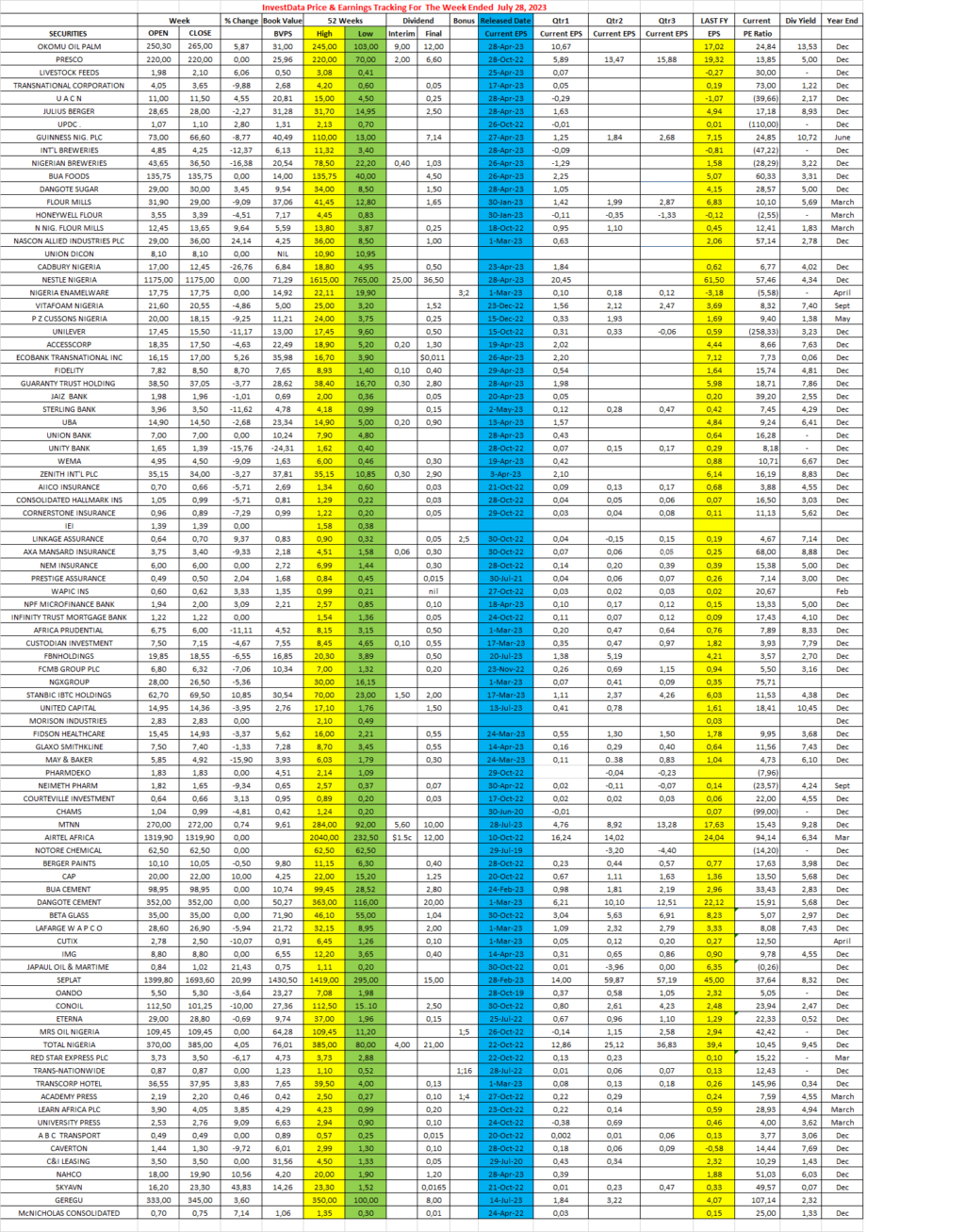 Equities Investdata Price, Earnings Tracking For Week Ended July 28, 2023 Editor July 30, 2023 1 min read 311 Post Views: 122 Continue Reading Previous: Mixed Trends On Portfolio Reshuffling, Review Of Fiscal Developments, Earnings InflowNext: Corporate Actions On NGX As Of Friday, July 28, 2023 Trending Now e-Tranzact Int’l Plc: Cautious Optimism, As Rising OPEX Blunts Impact Of Profit Growth, Better Ratios 1 e-Tranzact Int’l Plc: Cautious Optimism, As Rising OPEX Blunts Impact Of Profit Growth, Better Ratios January 31, 2026 Banking Profit-Taking Keeps NGX Under Pressure As Market Enters Consolidation Phase 2 Banking Profit-Taking Keeps NGX Under Pressure As Market Enters Consolidation Phase January 31, 2026 Corporate Actions On The Nigerian Bourse As Of Friday, January 30, 2026 3 Corporate Actions On The Nigerian Bourse As Of Friday, January 30, 2026 January 31, 2026 US Government Shutdown Fueling Anti-Dollar Trade, Expert Warns 4 US Government Shutdown Fueling Anti-Dollar Trade, Expert Warns January 30, 2026 Brent Crude Hits Six-Month High On Iran Tensions 5 Brent Crude Hits Six-Month High On Iran Tensions January 30, 2026 Recapitalisation Deadline: Nigeria’s Central Bank Hosts UK DFI, Restates Commitment To Financial Sector Reform, Long-Term Capital 6 Recapitalisation Deadline: Nigeria’s Central Bank Hosts UK DFI, Restates Commitment To Financial Sector Reform, Long-Term Capital January 30, 2026 Related Stories Banking Profit-Taking Keeps NGX Under Pressure As Market Enters Consolidation Phase 3 min read Equities Banking Profit-Taking Keeps NGX Under Pressure As Market Enters Consolidation Phase January 31, 2026 58 Corporate Actions On The Nigerian Bourse As Of Friday, January 30, 2026 1 min read Equities Corporate Actions On The Nigerian Bourse As Of Friday, January 30, 2026 January 31, 2026 47 NGX Edges Up on Renewed Investor Appetite, Strong Crude Prices 3 min read Equities NGX Edges Up on Renewed Investor Appetite, Strong Crude Prices January 29, 2026 150 Nigerian Stocks Retreat Midweek, Profit-Taking Deepens, As Market Eyes Near-Term Support 3 min read Equities Nigerian Stocks Retreat Midweek, Profit-Taking Deepens, As Market Eyes Near-Term Support January 29, 2026 162 NGX Closes Slightly Higher As Selective Buying Supports Market 3 min read Equities NGX Closes Slightly Higher As Selective Buying Supports Market January 28, 2026 177 NGX Consolidates As Bargain Hunting Counters Profit-Taking Amid Weak Volume 3 min read Equities NGX Consolidates As Bargain Hunting Counters Profit-Taking Amid Weak Volume January 27, 2026 170