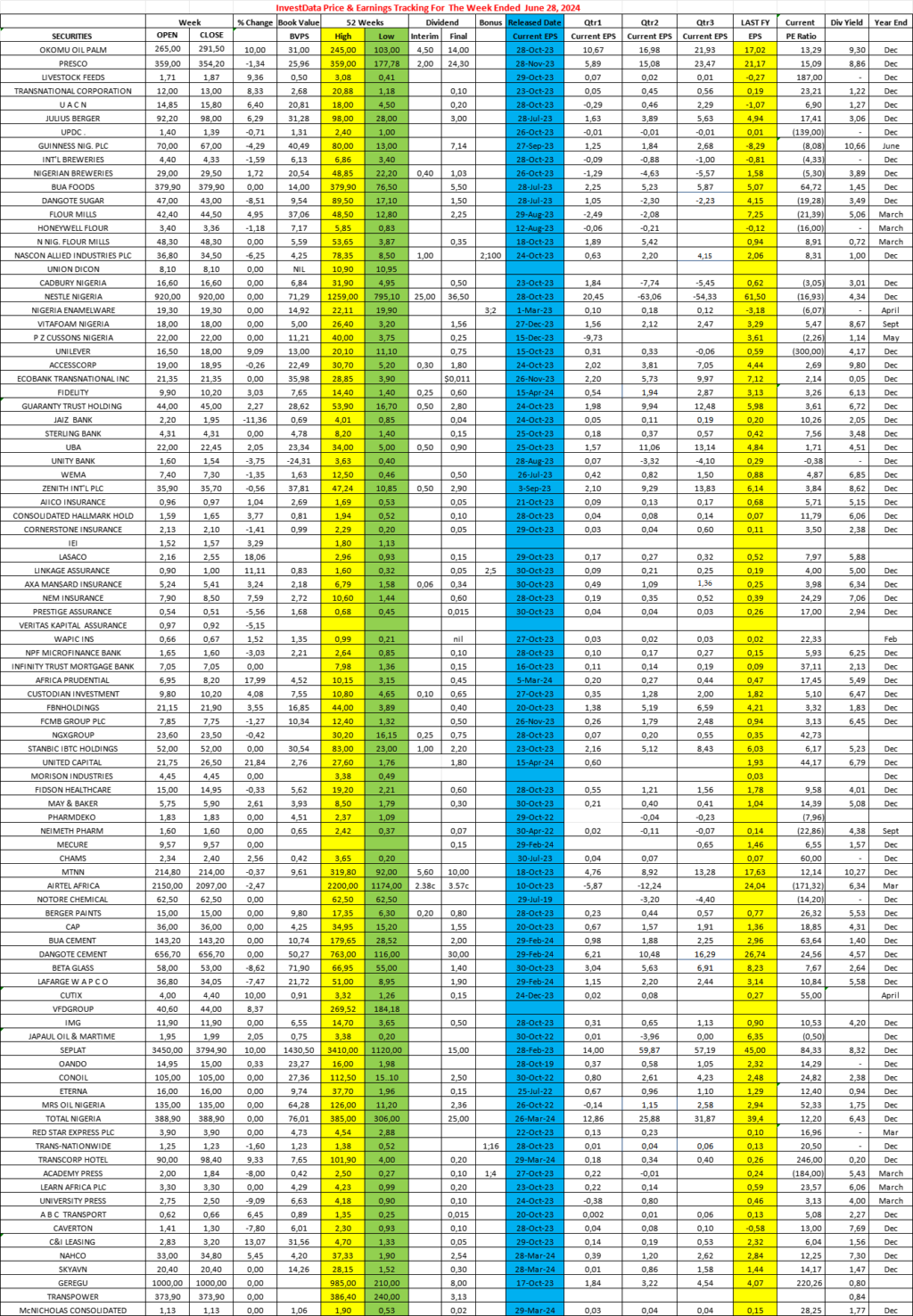 Equities Investdata Price, Earnings Tracking For Week Ended June 28, 2024 Editor July 1, 2024 1 min read 278 Post Views: 112 Continue Reading Previous: Understanding Market Structure Ahead Of Q2 Earnings Reporting SeasonNext: Corporate Actions On NGX As Of Friday, June 28, 2024 Trending Now Nigerian Bourse Ranges On Profit Taking Ahead Earnings Expectations, Sector Rotation 1 Nigerian Bourse Ranges On Profit Taking Ahead Earnings Expectations, Sector Rotation January 24, 2026 Corporate Actions On NGX As Of Friday, January 23, 2026 2 Corporate Actions On NGX As Of Friday, January 23, 2026 January 24, 2026 NGX Ends Week On Cautious Positive Note As Selective Buying Offsets Profit-Taking Pressures 3 NGX Ends Week On Cautious Positive Note As Selective Buying Offsets Profit-Taking Pressures January 24, 2026 NGX Ends Bearish On Heavyweight Selloffs Amid Cautious Sentiment 4 NGX Ends Bearish On Heavyweight Selloffs Amid Cautious Sentiment January 23, 2026 Oil Slides as Geopolitical Tensions Ease, But Supply Concerns Linger 5 Oil Slides as Geopolitical Tensions Ease, But Supply Concerns Linger January 23, 2026 BUA Cement, CBMI Seal US$240m Deal For 3mtpa Sokoto Plant Expansion In 20 Months 6 BUA Cement, CBMI Seal US$240m Deal For 3mtpa Sokoto Plant Expansion In 20 Months January 22, 2026 Related Stories Corporate Actions On NGX As Of Friday, January 23, 2026 1 min read Equities Corporate Actions On NGX As Of Friday, January 23, 2026 January 24, 2026 51 NGX Ends Week On Cautious Positive Note As Selective Buying Offsets Profit-Taking Pressures 3 min read Equities NGX Ends Week On Cautious Positive Note As Selective Buying Offsets Profit-Taking Pressures January 24, 2026 62 NGX Ends Bearish On Heavyweight Selloffs Amid Cautious Sentiment 2 min read Equities NGX Ends Bearish On Heavyweight Selloffs Amid Cautious Sentiment January 23, 2026 148 Cautious Bargain Hunting Lifts Equities Marginally Amid Mixed Sector Performance 3 min read Equities Cautious Bargain Hunting Lifts Equities Marginally Amid Mixed Sector Performance January 22, 2026 158 Nigerian Equities Post Modest Rebound As Bargain Hunting, Oil Strength Support Market 3 min read Equities Nigerian Equities Post Modest Rebound As Bargain Hunting, Oil Strength Support Market January 21, 2026 191 Nigerian Equities End Flat-To-Bearish As Profit Taking Offsets Broad Buying, Composite Index Holds Key Support 3 min read Equities Nigerian Equities End Flat-To-Bearish As Profit Taking Offsets Broad Buying, Composite Index Holds Key Support January 20, 2026 195