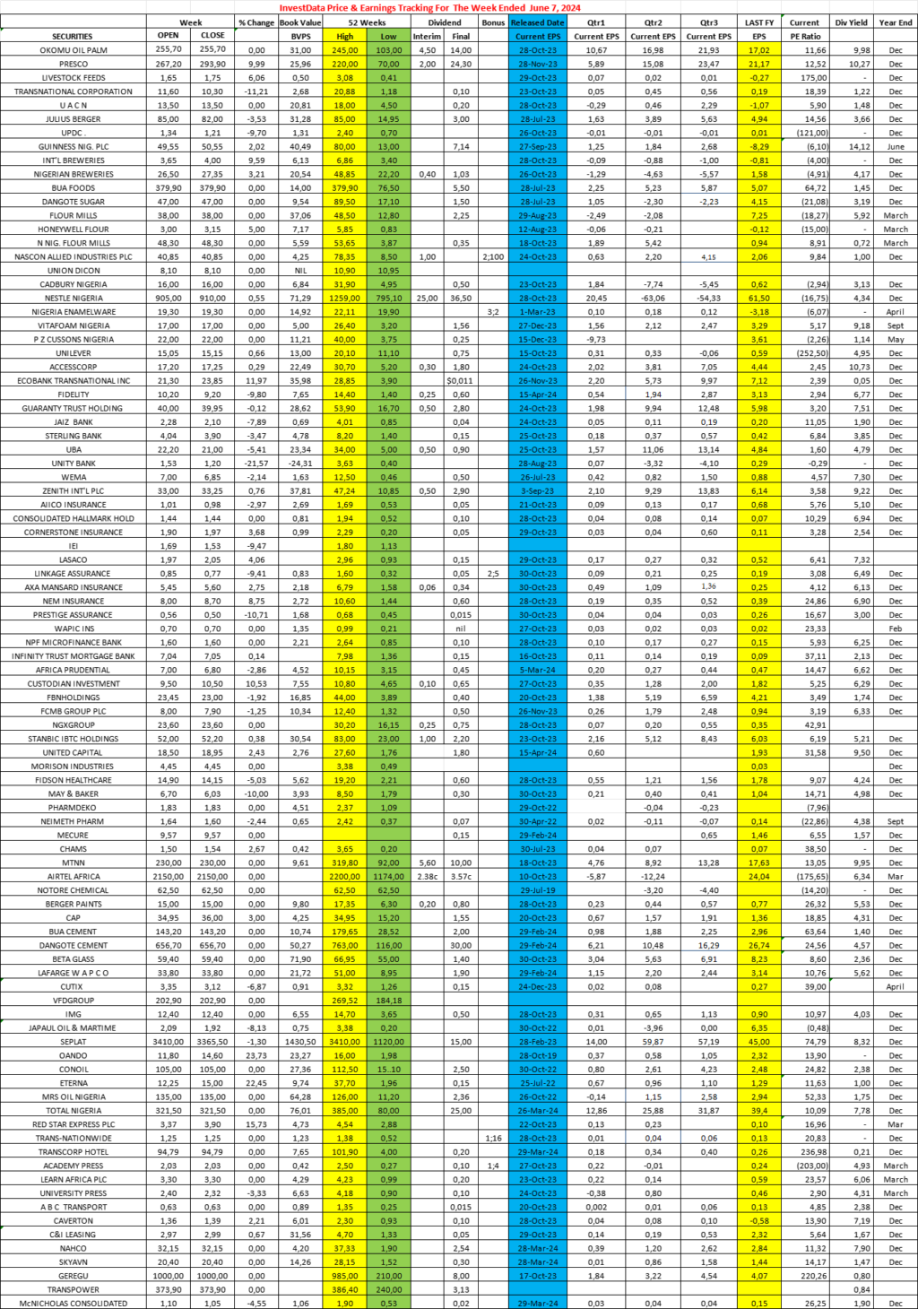 Equities Investdata Price, Earnings Tracking For Week Ended June 7, 2024 Editor June 9, 2024 1 min read 302 Post Views: 137 Continue Reading Previous: Mixed Sentiments Still, Amid Low Valuation, As Investors Position On PullbacksNext: Corporate Actions On NGX As Of Friday, June 7, 2024 Trending Now NGX Ends Christmas Eve Higher As Banking, Consumer Stocks Advance 1 NGX Ends Christmas Eve Higher As Banking, Consumer Stocks Advance December 24, 2025 NGX Sustains Bullish Momentum As Buying Pressure Keeps Market On The Upside 2 NGX Sustains Bullish Momentum As Buying Pressure Keeps Market On The Upside December 23, 2025 NGX Extends Rally As Sector Rotation Persists 3 NGX Extends Rally As Sector Rotation Persists December 23, 2025 Oil Prices Edge Higher On Venezuela, Ukraine Tensions 4 Oil Prices Edge Higher On Venezuela, Ukraine Tensions December 23, 2025 SEC Nigeria Gives Capital Market Operators January 31 Deadline To Renew Registration 5 SEC Nigeria Gives Capital Market Operators January 31 Deadline To Renew Registration December 21, 2025 Investdata To Offer Tactical Trading Strategy For Higher Returns On NGX At 2026Q1 Master Class 6 Investdata To Offer Tactical Trading Strategy For Higher Returns On NGX At 2026Q1 Master Class December 20, 2025 Related Stories NGX Ends Christmas Eve Higher As Banking, Consumer Stocks Advance 5 min read Equities NGX Ends Christmas Eve Higher As Banking, Consumer Stocks Advance December 24, 2025 130 NGX Sustains Bullish Momentum As Buying Pressure Keeps Market On The Upside 5 min read Equities NGX Sustains Bullish Momentum As Buying Pressure Keeps Market On The Upside December 23, 2025 143 NGX Extends Rally As Sector Rotation Persists 5 min read Equities NGX Extends Rally As Sector Rotation Persists December 23, 2025 143 Corporate Actions On NGX As Of Friday, December 19, 2025 1 min read Equities Corporate Actions On NGX As Of Friday, December 19, 2025 December 20, 2025 139 NGX Stretches Winning Streak To Seven Sessions As Broad Buying Keeps Bulls In Control 3 min read Equities NGX Stretches Winning Streak To Seven Sessions As Broad Buying Keeps Bulls In Control December 19, 2025 210 NGX Maintains Uptrend As Investors Accumulate Blue Chips Despite Slower Trading Activity 3 min read Equities NGX Maintains Uptrend As Investors Accumulate Blue Chips Despite Slower Trading Activity December 18, 2025 188