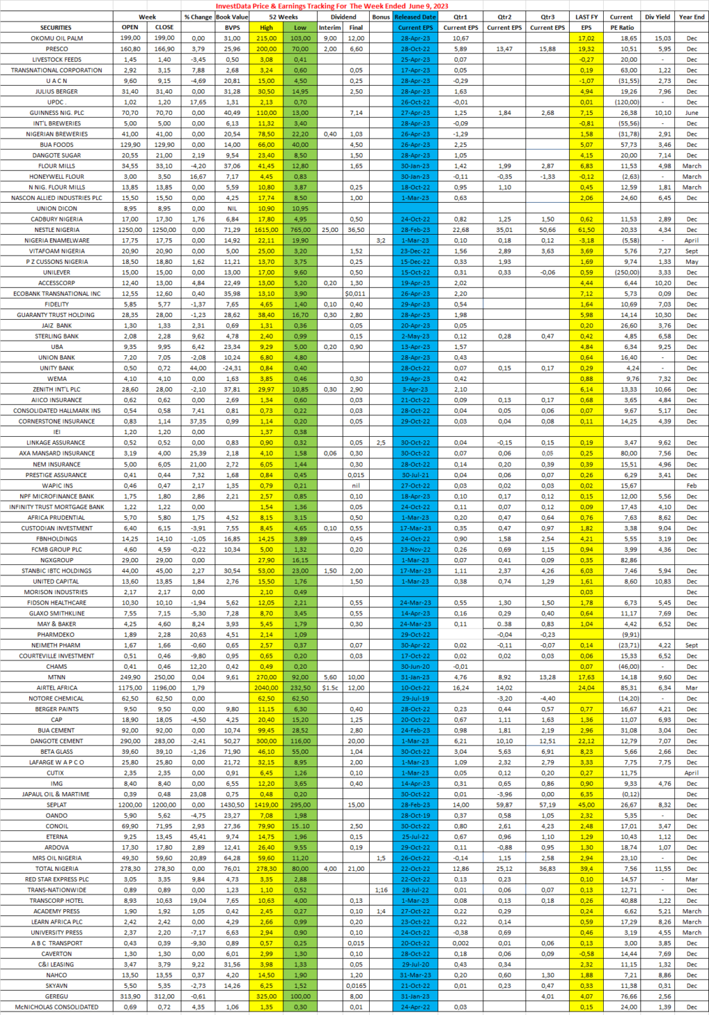 Equities Investdata Price, Earnings Tracking For Week Ended June 9, 2023 Editor June 10, 2023 1 min read 332 Post Views: 121 Continue Reading Previous: Investors Await Market Direction, Realign Portfolios, Amid Bearish Divergence, Markdown DatesNext: Corporate Actions On NGX As Of Friday, June 9, 2023 Trending Now NGX Ends Bearish On Heavyweight Selloffs Amid Cautious Sentiment 1 NGX Ends Bearish On Heavyweight Selloffs Amid Cautious Sentiment January 23, 2026 Oil Slides as Geopolitical Tensions Ease, But Supply Concerns Linger 2 Oil Slides as Geopolitical Tensions Ease, But Supply Concerns Linger January 23, 2026 BUA Cement, CBMI Seal US$240m Deal For 3mtpa Sokoto Plant Expansion In 20 Months 3 BUA Cement, CBMI Seal US$240m Deal For 3mtpa Sokoto Plant Expansion In 20 Months January 22, 2026 Cautious Bargain Hunting Lifts Equities Marginally Amid Mixed Sector Performance 4 Cautious Bargain Hunting Lifts Equities Marginally Amid Mixed Sector Performance January 22, 2026 Oil Prices Tick Up On Kazakhstan Supply Disruptions 5 Oil Prices Tick Up On Kazakhstan Supply Disruptions January 22, 2026 Nigerian Equities Post Modest Rebound As Bargain Hunting, Oil Strength Support Market 6 Nigerian Equities Post Modest Rebound As Bargain Hunting, Oil Strength Support Market January 21, 2026 Related Stories NGX Ends Bearish On Heavyweight Selloffs Amid Cautious Sentiment 2 min read Equities NGX Ends Bearish On Heavyweight Selloffs Amid Cautious Sentiment January 23, 2026 116 Cautious Bargain Hunting Lifts Equities Marginally Amid Mixed Sector Performance 3 min read Equities Cautious Bargain Hunting Lifts Equities Marginally Amid Mixed Sector Performance January 22, 2026 134 Nigerian Equities Post Modest Rebound As Bargain Hunting, Oil Strength Support Market 3 min read Equities Nigerian Equities Post Modest Rebound As Bargain Hunting, Oil Strength Support Market January 21, 2026 178 Nigerian Equities End Flat-To-Bearish As Profit Taking Offsets Broad Buying, Composite Index Holds Key Support 3 min read Equities Nigerian Equities End Flat-To-Bearish As Profit Taking Offsets Broad Buying, Composite Index Holds Key Support January 20, 2026 192 Corporate Actions On The Nigerian Bourse As Of Friday, January 16, 2026 1 min read Equities Corporate Actions On The Nigerian Bourse As Of Friday, January 16, 2026 January 17, 2026 177 NGX Ends Week Stronger Amid Bullish Trend Despite Profit-Taking, Ahead Of Earnings Inflow 7 min read Equities NGX Ends Week Stronger Amid Bullish Trend Despite Profit-Taking, Ahead Of Earnings Inflow January 17, 2026 224