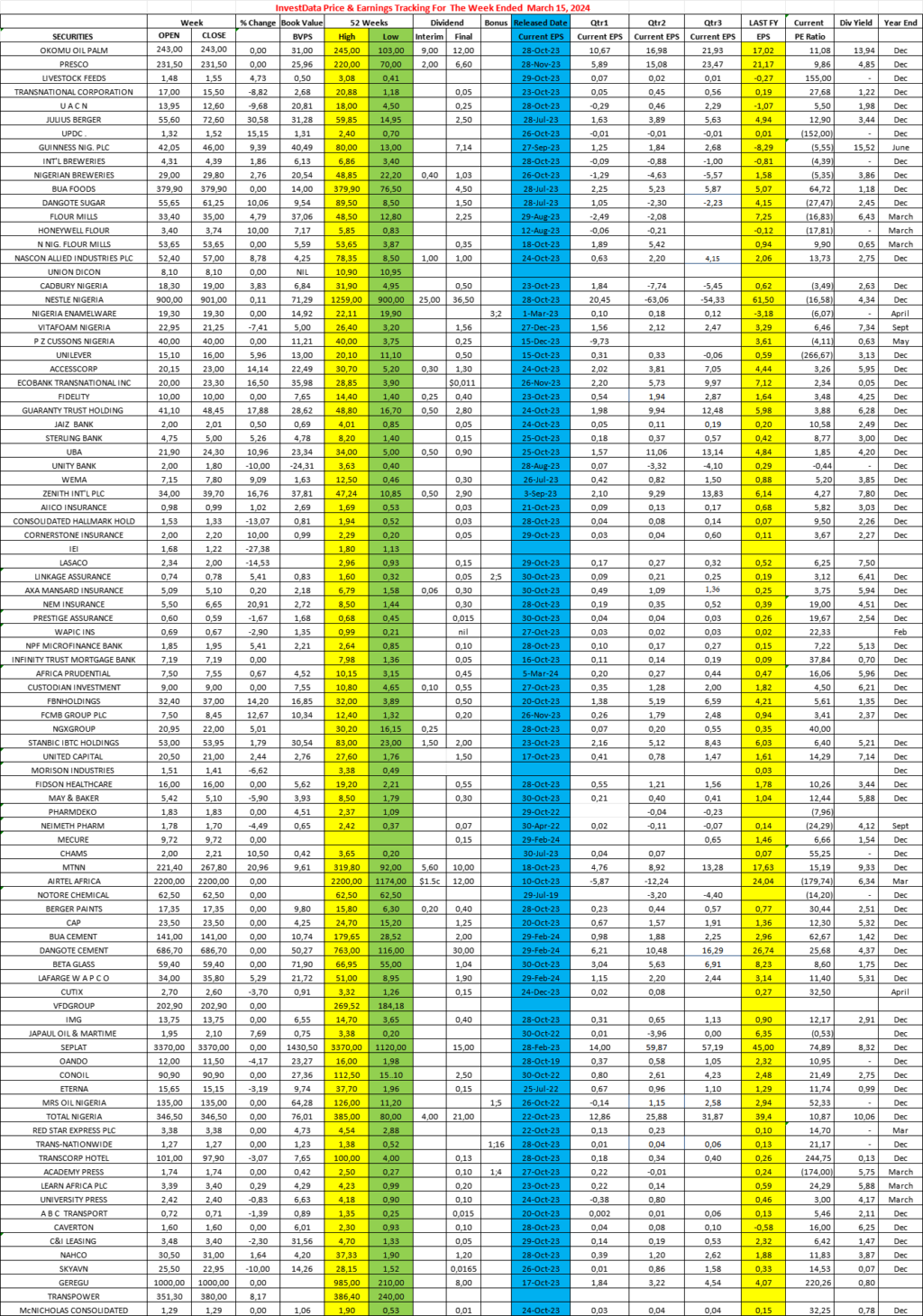 Equities Investdata Price, Earnings Tracking For Week Ended March 15, 2024 Editor March 16, 2024 1 min read 343 Post Views: 91 Continue Reading Previous: Trend Stays Mixed As All Eyes On February Inflation Data, MPC Meeting, More Corporate ActionsNext: Corporate Actions On NGX As Of Friday, March 15, 2024 Trending Now NGX Onboards Dangote Cement’s ₦119.87bn Issuance As First Commercial Paper Listing 1 NGX Onboards Dangote Cement’s ₦119.87bn Issuance As First Commercial Paper Listing February 19, 2026 Sustaining The Current Growth Drivers Of Nigerian Economy 2 Sustaining The Current Growth Drivers Of Nigerian Economy February 19, 2026 Oil Rises Nearly 3% As Ukraine Talks Stall, Iran Tensions Loom 3 Oil Rises Nearly 3% As Ukraine Talks Stall, Iran Tensions Loom February 19, 2026 Nigeria’s Market Reverses Prior Losses As Strategic Positioning Pushes Composite Index Higher 4 Nigeria’s Market Reverses Prior Losses As Strategic Positioning Pushes Composite Index Higher February 19, 2026 Oil Slips As U.S–Iran Talks Ease Tensions 5 Oil Slips As U.S–Iran Talks Ease Tensions February 18, 2026 NGX Retreats On Profit-Taking As Banking Heavyweights Weigh In 6 NGX Retreats On Profit-Taking As Banking Heavyweights Weigh In February 18, 2026 Related Stories Nigeria’s Market Reverses Prior Losses As Strategic Positioning Pushes Composite Index Higher 3 min read Equities Nigeria’s Market Reverses Prior Losses As Strategic Positioning Pushes Composite Index Higher February 19, 2026 110 NGX Retreats On Profit-Taking As Banking Heavyweights Weigh In 3 min read Equities NGX Retreats On Profit-Taking As Banking Heavyweights Weigh In February 18, 2026 124 Equities Rally Deepens As Nigeria’s Composite Index Hits Fresh All-Time High On Broad-Based Buying Pressure 4 min read Equities Equities Rally Deepens As Nigeria’s Composite Index Hits Fresh All-Time High On Broad-Based Buying Pressure February 17, 2026 175 Corporate Actions On Nigerian Bourse As Of Friday, February 13, 2026 1 min read Equities Corporate Actions On Nigerian Bourse As Of Friday, February 13, 2026 February 16, 2026 151 NGX Closes Week Strong As Blue Chips Drive Composite Index Higher 3 min read Equities NGX Closes Week Strong As Blue Chips Drive Composite Index Higher February 13, 2026 289 Nigeria’s Equity Market Maintains Bullish Bias As Selective Buying Drives Gains 3 min read Equities Nigeria’s Equity Market Maintains Bullish Bias As Selective Buying Drives Gains February 13, 2026 181