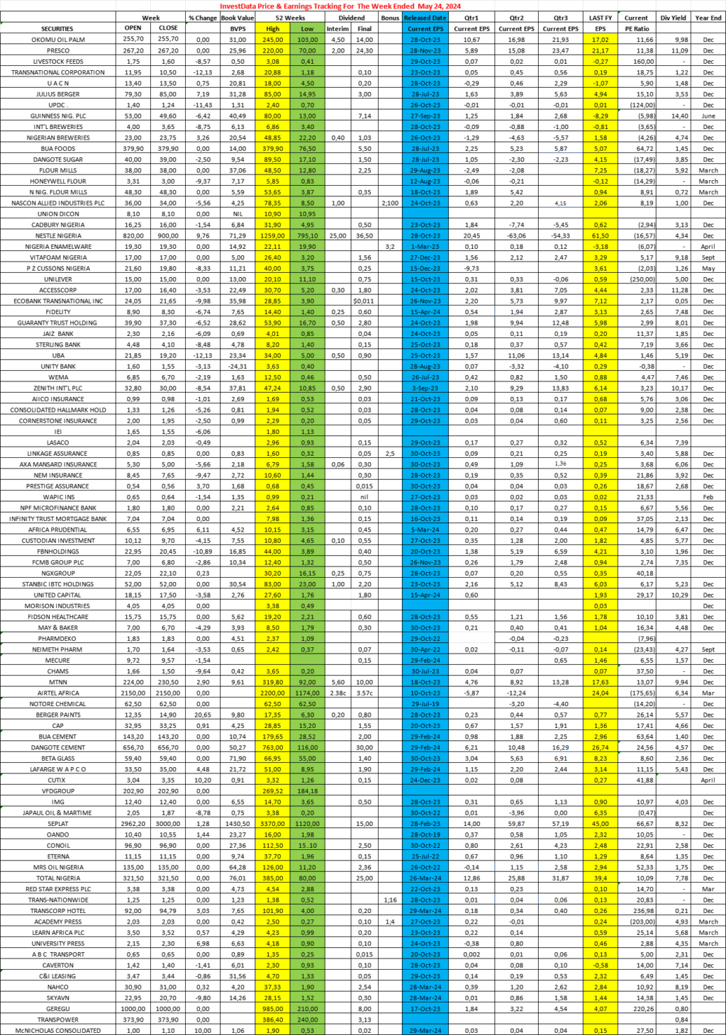 Equities Investdata Price, Earnings Tracking For Week Ended May 24, 2024 Editor May 27, 2024 1 min read 346 Post Views: 105 Continue Reading Previous: Bear-run Continues On NGX, As Investors Rebalance Portfolios, Eye Fixed Income InstrumentsNext: Corporate Actions On NGX As Of Friday, May 24, 2024 Trending Now NGX Sustains Bullish Momentum As Buying Pressure Keeps Market On The Upside 1 NGX Sustains Bullish Momentum As Buying Pressure Keeps Market On The Upside December 23, 2025 NGX Extends Rally As Sector Rotation Persists 2 NGX Extends Rally As Sector Rotation Persists December 23, 2025 Oil Prices Edge Higher On Venezuela, Ukraine Tensions 3 Oil Prices Edge Higher On Venezuela, Ukraine Tensions December 23, 2025 SEC Nigeria Gives Capital Market Operators January 31 Deadline To Renew Registration 4 SEC Nigeria Gives Capital Market Operators January 31 Deadline To Renew Registration December 21, 2025 Investdata To Offer Tactical Trading Strategy For Higher Returns On NGX At 2026Q1 Master Class 5 Investdata To Offer Tactical Trading Strategy For Higher Returns On NGX At 2026Q1 Master Class December 20, 2025 Corporate Actions On NGX As Of Friday, December 19, 2025 6 Corporate Actions On NGX As Of Friday, December 19, 2025 December 20, 2025 Related Stories NGX Sustains Bullish Momentum As Buying Pressure Keeps Market On The Upside 5 min read Equities NGX Sustains Bullish Momentum As Buying Pressure Keeps Market On The Upside December 23, 2025 82 NGX Extends Rally As Sector Rotation Persists 5 min read Equities NGX Extends Rally As Sector Rotation Persists December 23, 2025 95 Corporate Actions On NGX As Of Friday, December 19, 2025 1 min read Equities Corporate Actions On NGX As Of Friday, December 19, 2025 December 20, 2025 109 NGX Stretches Winning Streak To Seven Sessions As Broad Buying Keeps Bulls In Control 3 min read Equities NGX Stretches Winning Streak To Seven Sessions As Broad Buying Keeps Bulls In Control December 19, 2025 201 NGX Maintains Uptrend As Investors Accumulate Blue Chips Despite Slower Trading Activity 3 min read Equities NGX Maintains Uptrend As Investors Accumulate Blue Chips Despite Slower Trading Activity December 18, 2025 185 Cautious Buying Persists As Select Stocks Drive Marginal Market Upside 4 min read Equities Cautious Buying Persists As Select Stocks Drive Marginal Market Upside December 16, 2025 118