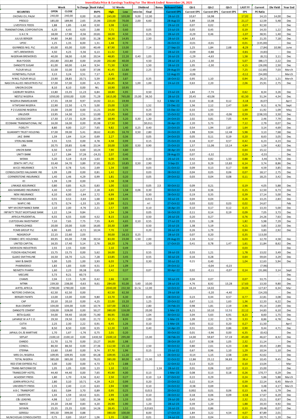 Equities Investdata Price, Earnings Tracking For Week Ended November 24, 2023 Editor November 25, 2023 1 min read 331 Post Views: 105 Continue Reading Previous: Expect Mixed Sentiment, Amid Sector Rotation, Positioning In Blue Chips, Ahead Of 2024 Dividend SeasonNext: Corporate Actions On NGX As Of Friday, November 24, 2023 Trending Now Nigeria’s Equity Market Opens 2026 With New High, As Post-Christmas Rally Extends AmidEarnings Expectation 1 Nigeria’s Equity Market Opens 2026 With New High, As Post-Christmas Rally Extends AmidEarnings Expectation January 4, 2026 Corporate Actions On Nigerian Bourse As Of Friday, January 2, 2026 2 Corporate Actions On Nigerian Bourse As Of Friday, January 2, 2026 January 4, 2026 Muted Oil Reaction To Mask Deeper Risk Of Venezuela Strike 3 Muted Oil Reaction To Mask Deeper Risk Of Venezuela Strike January 3, 2026 NGX Begins 2026 On Strong Footing As Selective Buying Lifts Banking, Mid-Cap Stocks 4 NGX Begins 2026 On Strong Footing As Selective Buying Lifts Banking, Mid-Cap Stocks January 3, 2026 NGX 2025 Year-End Review: Consumer Goods, Industrials Drive Historic 51% Surge, Set Stage For 2026 On Nigerian Bourse 5 NGX 2025 Year-End Review: Consumer Goods, Industrials Drive Historic 51% Surge, Set Stage For 2026 On Nigerian Bourse January 2, 2026 SEC Nigeria Mulls Green Energy Bonds, PPPs To Tackle National Power Sector Challenges 6 SEC Nigeria Mulls Green Energy Bonds, PPPs To Tackle National Power Sector Challenges January 1, 2026 Related Stories Corporate Actions On Nigerian Bourse As Of Friday, January 2, 2026 1 min read Equities Corporate Actions On Nigerian Bourse As Of Friday, January 2, 2026 January 4, 2026 45 NGX Begins 2026 On Strong Footing As Selective Buying Lifts Banking, Mid-Cap Stocks 2 min read Equities NGX Begins 2026 On Strong Footing As Selective Buying Lifts Banking, Mid-Cap Stocks January 3, 2026 119 NGX 2025 Year-End Review: Consumer Goods, Industrials Drive Historic 51% Surge, Set Stage For 2026 On Nigerian Bourse 4 min read Equities NGX 2025 Year-End Review: Consumer Goods, Industrials Drive Historic 51% Surge, Set Stage For 2026 On Nigerian Bourse January 2, 2026 269 NGX Closes 2025 Strong As Late Buying Lifts Banking Stocks, Market Breadth Improves 5 min read Equities NGX Closes 2025 Strong As Late Buying Lifts Banking Stocks, Market Breadth Improves December 31, 2025 159 Nigerian Equities Sustain Rally As Liquidity, Sector Rotation Support Gains 5 min read Equities Nigerian Equities Sustain Rally As Liquidity, Sector Rotation Support Gains December 30, 2025 165 Nigerian Stocks Extend Santa Claus Rally As Composite Index Hits Fresh High 5 min read Equities Nigerian Stocks Extend Santa Claus Rally As Composite Index Hits Fresh High December 29, 2025 252