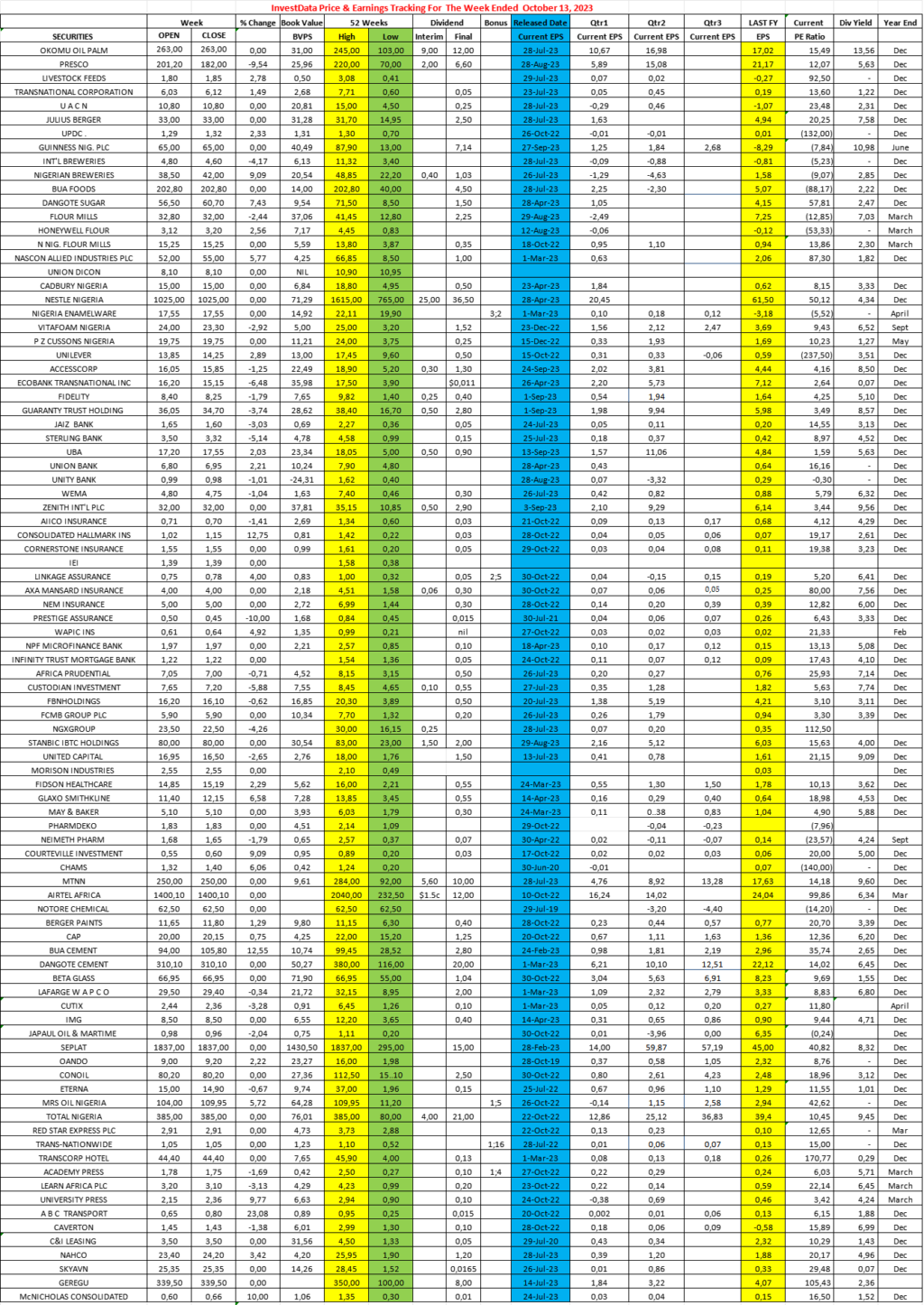 Equities Investdata price, Earnings Tracking For Week Ended October 13, 2023 Editor October 15, 2023 1 min read 291 Post Views: 72 Continue Reading Previous: Mixed Trends Amid Bargain Hunting, As Investors Bet On Sept Inflation, Q3 Earnings, Await Policy TriggersNext: Corporate Actions On NGX As Of Friday, October 13, 2023 Trending Now US Government Shutdown Fueling Anti-Dollar Trade, Expert Warns 1 US Government Shutdown Fueling Anti-Dollar Trade, Expert Warns January 30, 2026 Brent Crude Hits Six-Month High On Iran Tensions 2 Brent Crude Hits Six-Month High On Iran Tensions January 30, 2026 Recapitalisation Deadline: Nigeria’s Central Bank Hosts UK DFI, Restates Commitment To Financial Sector Reform, Long-Term Capital 3 Recapitalisation Deadline: Nigeria’s Central Bank Hosts UK DFI, Restates Commitment To Financial Sector Reform, Long-Term Capital January 30, 2026 NGX Edges Up on Renewed Investor Appetite, Strong Crude Prices 4 NGX Edges Up on Renewed Investor Appetite, Strong Crude Prices January 29, 2026 Oil Hits Four-Month High On US Storms Disruptions, Supply Concerns 5 Oil Hits Four-Month High On US Storms Disruptions, Supply Concerns January 29, 2026 Nigerian Stocks Retreat Midweek, Profit-Taking Deepens, As Market Eyes Near-Term Support 6 Nigerian Stocks Retreat Midweek, Profit-Taking Deepens, As Market Eyes Near-Term Support January 29, 2026 Related Stories NGX Edges Up on Renewed Investor Appetite, Strong Crude Prices 3 min read Equities NGX Edges Up on Renewed Investor Appetite, Strong Crude Prices January 29, 2026 111 Nigerian Stocks Retreat Midweek, Profit-Taking Deepens, As Market Eyes Near-Term Support 3 min read Equities Nigerian Stocks Retreat Midweek, Profit-Taking Deepens, As Market Eyes Near-Term Support January 29, 2026 147 NGX Closes Slightly Higher As Selective Buying Supports Market 3 min read Equities NGX Closes Slightly Higher As Selective Buying Supports Market January 28, 2026 155 NGX Consolidates As Bargain Hunting Counters Profit-Taking Amid Weak Volume 3 min read Equities NGX Consolidates As Bargain Hunting Counters Profit-Taking Amid Weak Volume January 27, 2026 167 Corporate Actions On NGX As Of Friday, January 23, 2026 1 min read Equities Corporate Actions On NGX As Of Friday, January 23, 2026 January 24, 2026 190 NGX Ends Week On Cautious Positive Note As Selective Buying Offsets Profit-Taking Pressures 3 min read Equities NGX Ends Week On Cautious Positive Note As Selective Buying Offsets Profit-Taking Pressures January 24, 2026 160